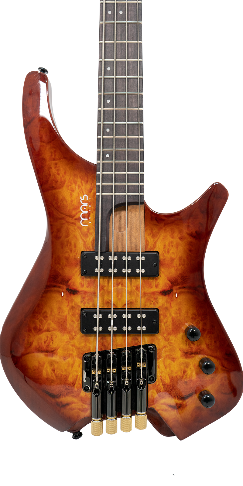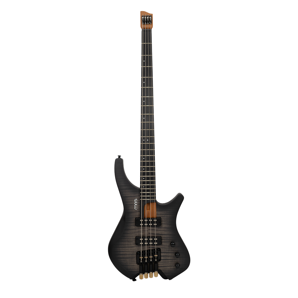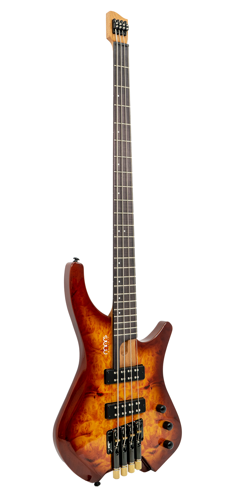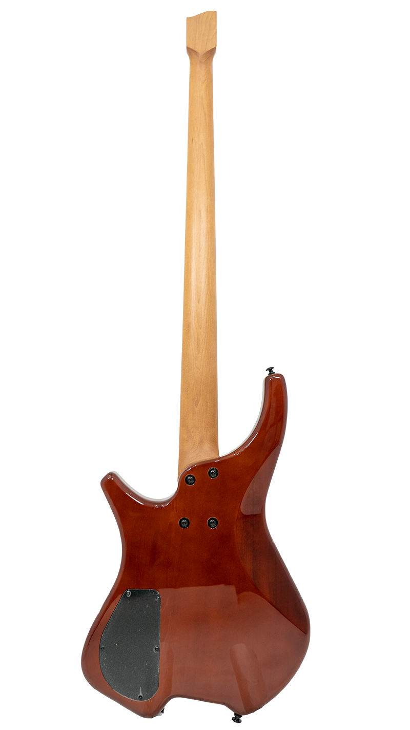 Bajo Mars Headless 4, cuidadosamente diseñado con materiales de alta calidad y detalles excepcionales. El cuerpo está construido en madera de álamo (poplar) combinada con un chapado de arce burl que le otorga un aspecto único y elegante. El mástil de arce canadiense asado, conocido por su durabilidad y tonalidad, con un diseño de mástil atornillado para una mayor estabilidad y comodidad al tocar. El diapasón está hecho de rosewood y presenta un diseño de trastes fan fret, lo que favorece la ergonomía y la facilidad para alcanzar notas altas con mayor comodidad.