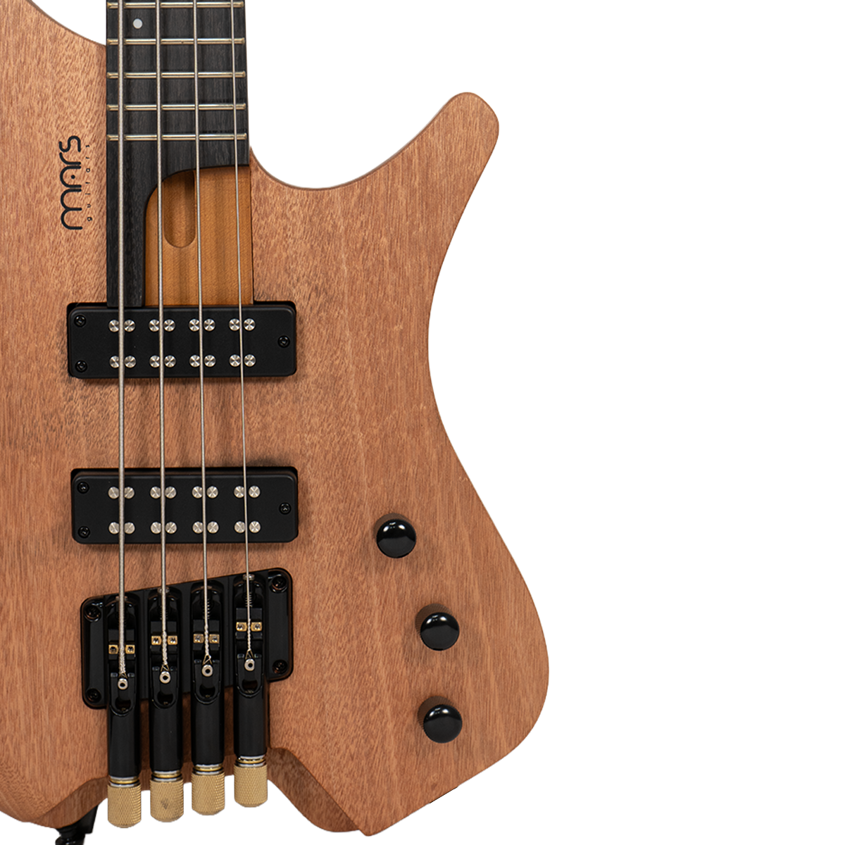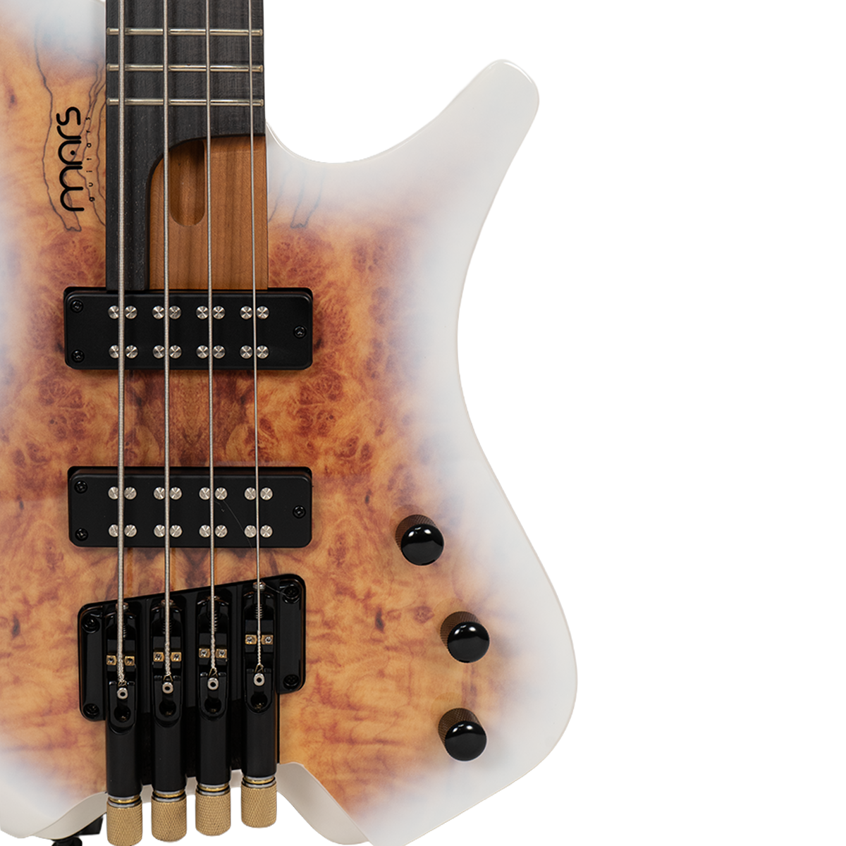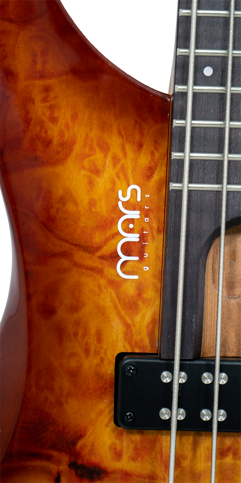 Bajo Mars Headless 4, cuidadosamente diseñado con materiales de alta calidad y detalles excepcionales. El cuerpo está construido en madera de álamo (poplar) combinada con un chapado de arce burl que le otorga un aspecto único y elegante. El mástil de arce canadiense asado, conocido por su durabilidad y tonalidad, con un diseño de mástil atornillado para una mayor estabilidad y comodidad al tocar. El diapasón está hecho de rosewood y presenta un diseño de trastes fan fret, lo que favorece la ergonomía y la facilidad para alcanzar notas altas con mayor comodidad.