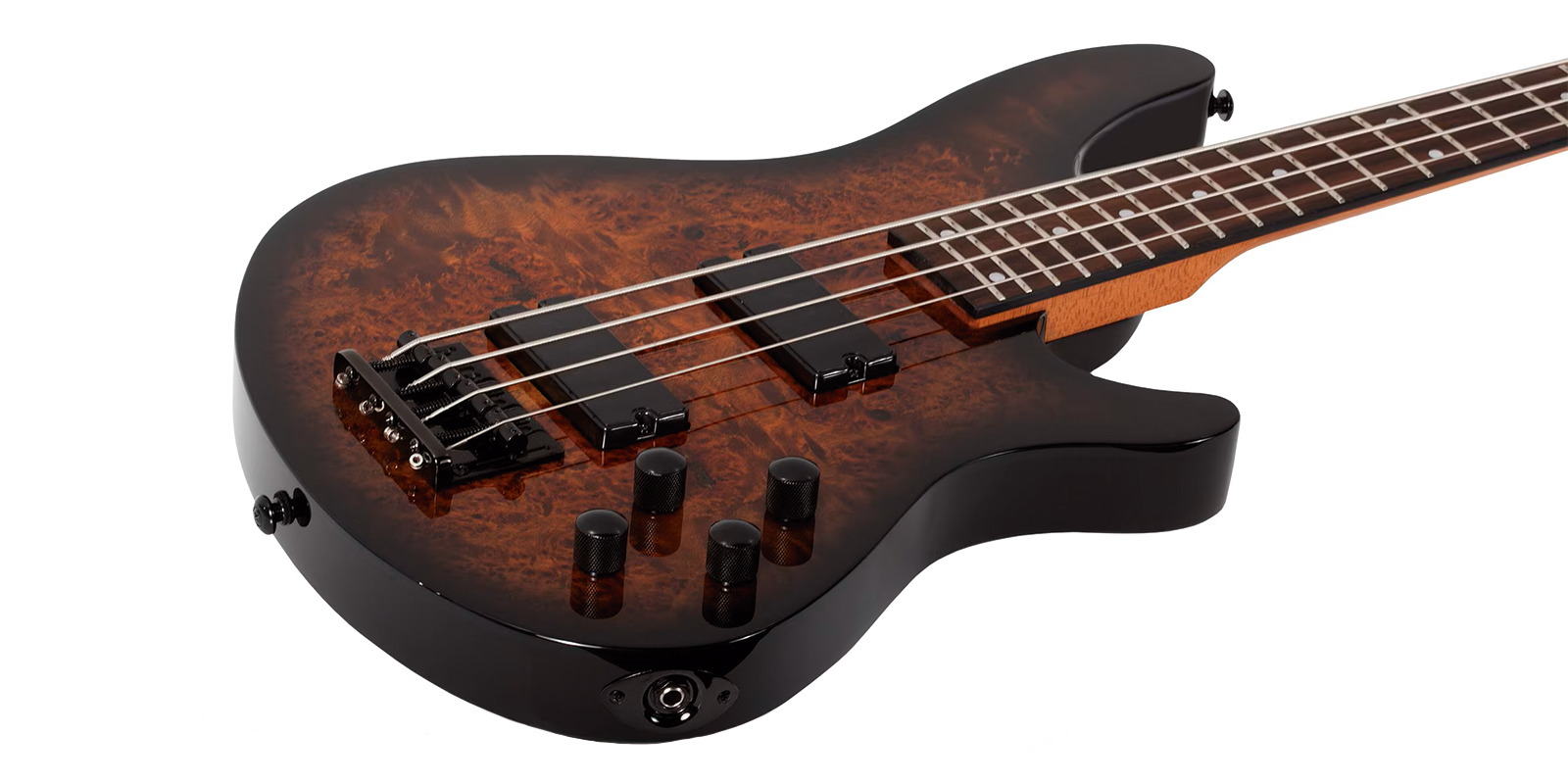 El cuerpo es de mahogany con una tapa de burl figurado, dando un aspecto elegante. La construcción de tipo bolt-on y el puente Schecter Diamond Bass aseguran estabilidad y una resonancia rica. Los controles incluyen volúmenes y tonos para el puente y el mástil, permitiendo ajustes precisos del sonido.