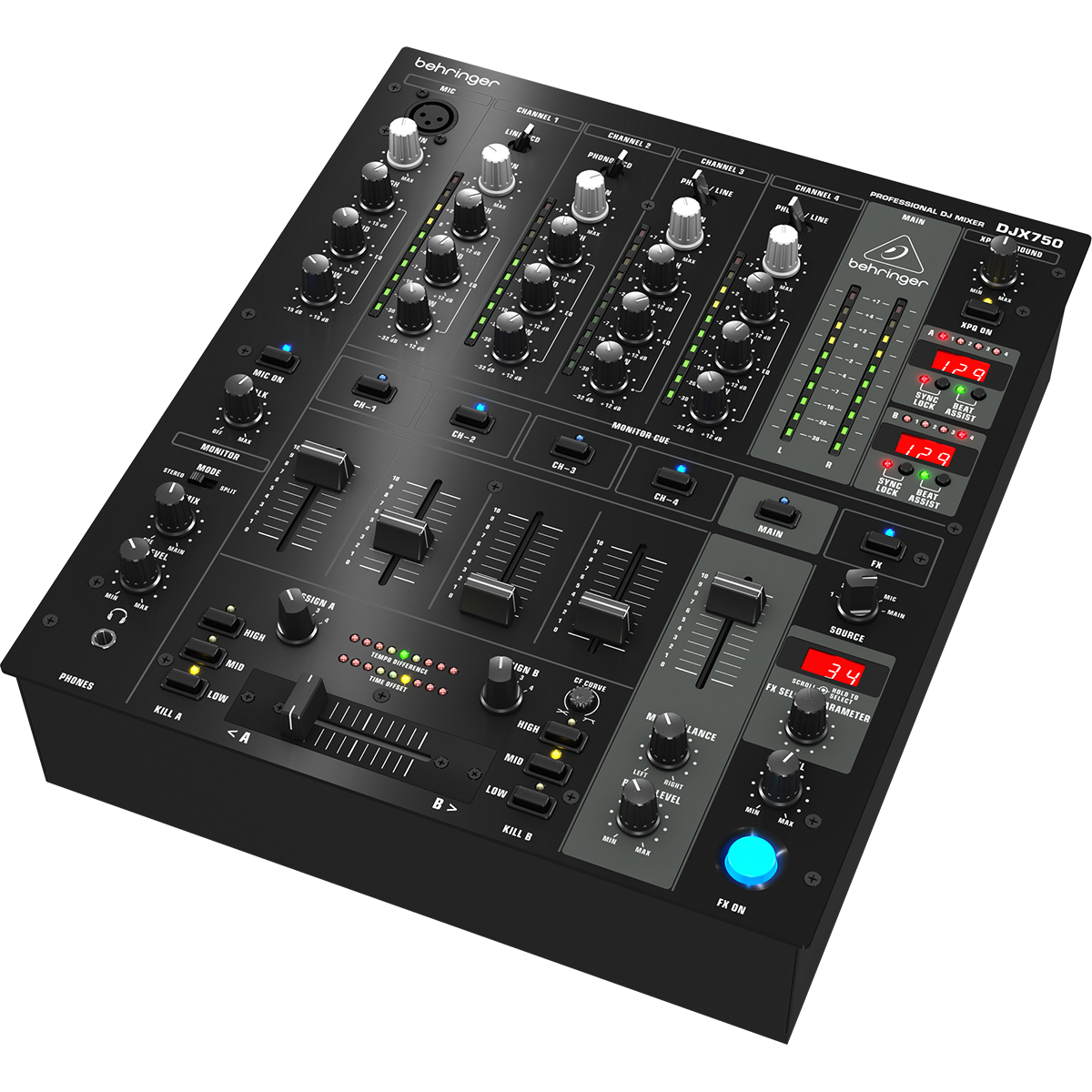 Si puede hacer click, hablar o girar, la mezcladora DJX750 puede mezclar. Obtienes dos canales phono/line estéreo, un canal phono/CD y un canal Line/CD más un canal dedicado de micrófono con botón Mic On y control de nivel Talk. Todos los canales cuentan con control de ganancia independiente y un ecualizador de 3 bandas full Kill en los canales 1 a 4, que también proporcionan medidor LED. La DJX750 también tiene preamplificadores integrados de alta calidad para manejar hasta 3 tornamesas.