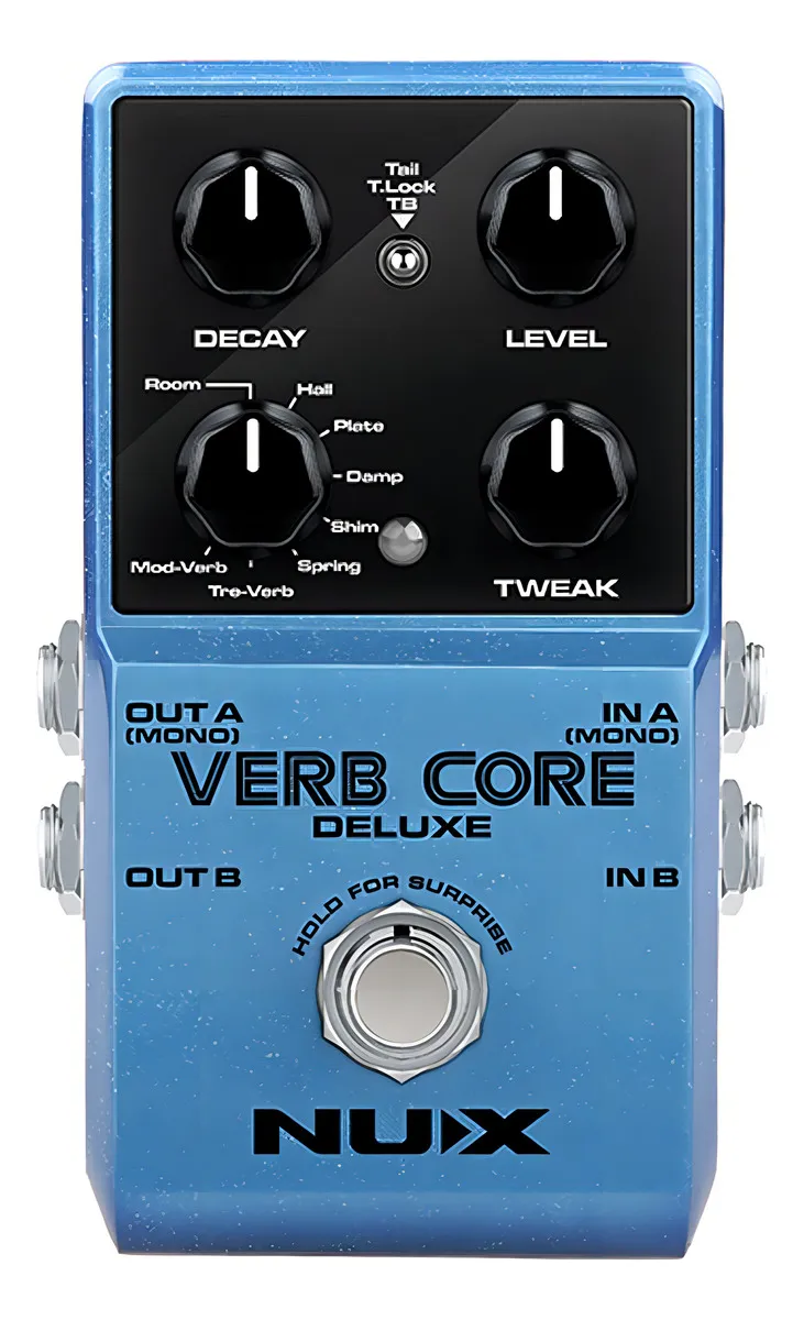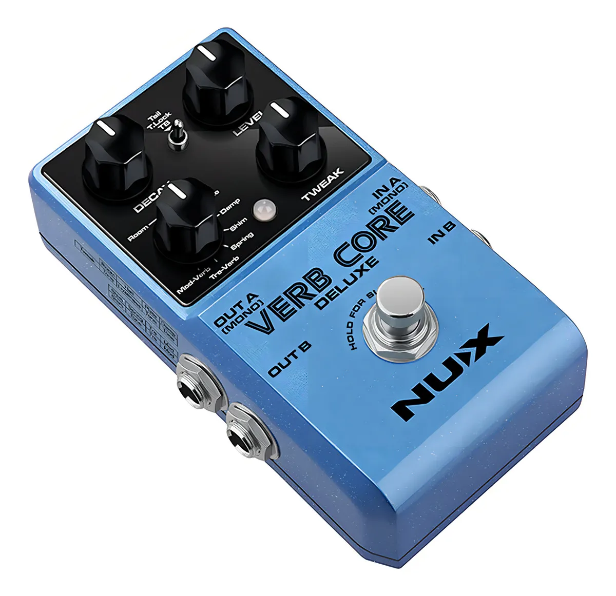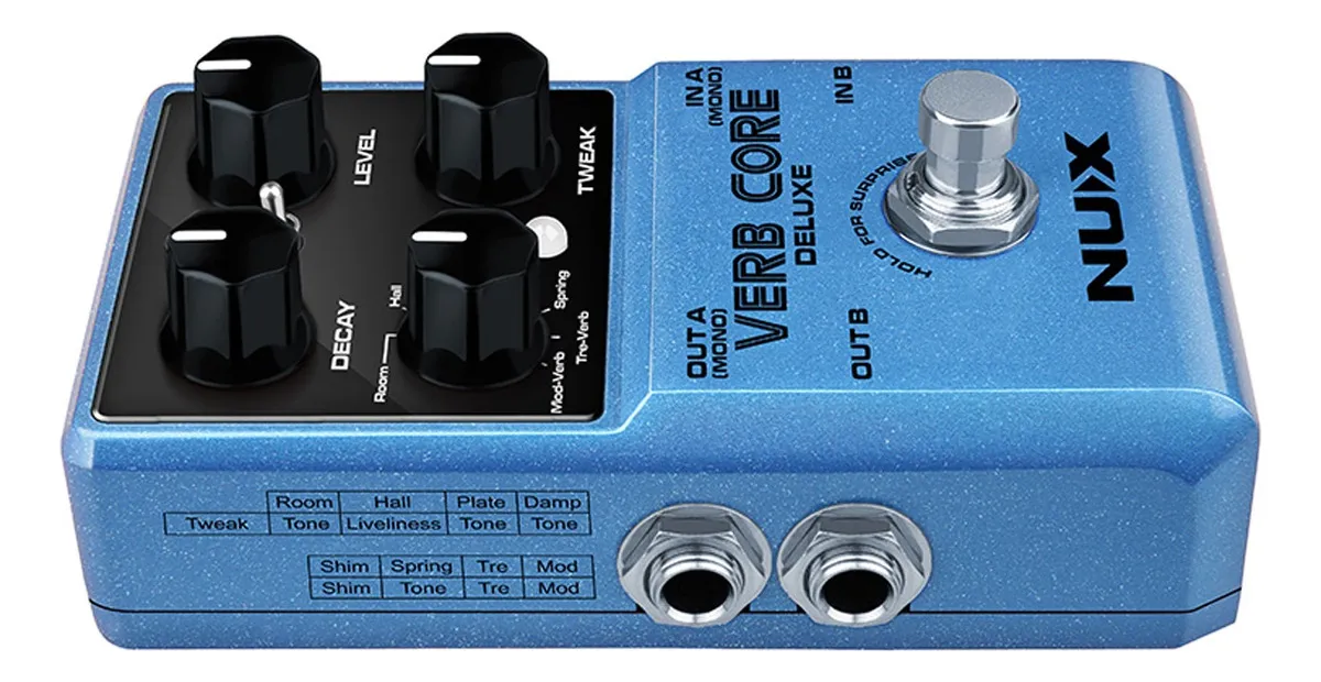 El NUX VERB CORE DELUXE es un pedal de reverberación con 8 tipos diferentes, incluidos Room, Hall, Plate, Damp, Shim, Spring, Tre-Verb y Mod Verb. Puede seleccionar el tipo de reverberación utilizando el mando Type. Interfaz de usuario intuitiva con perilla de decadencia, ajusta la duración del tiempo de reverberación. Perilla de nivel que ajusta el nivel de mezcla húmeda/seca de la reverberación, desde 0% hasta 100% cuando gira la perilla en el sentido de las agujas del reloj. Perilla de tipo de reverberación, perilla de ajuste, interruptor de palanca, pedal e indicador FS. Conectores de E/S. DC Jack, Puerto USB-C, conectores estándar de 1/4″ (mono/TS)