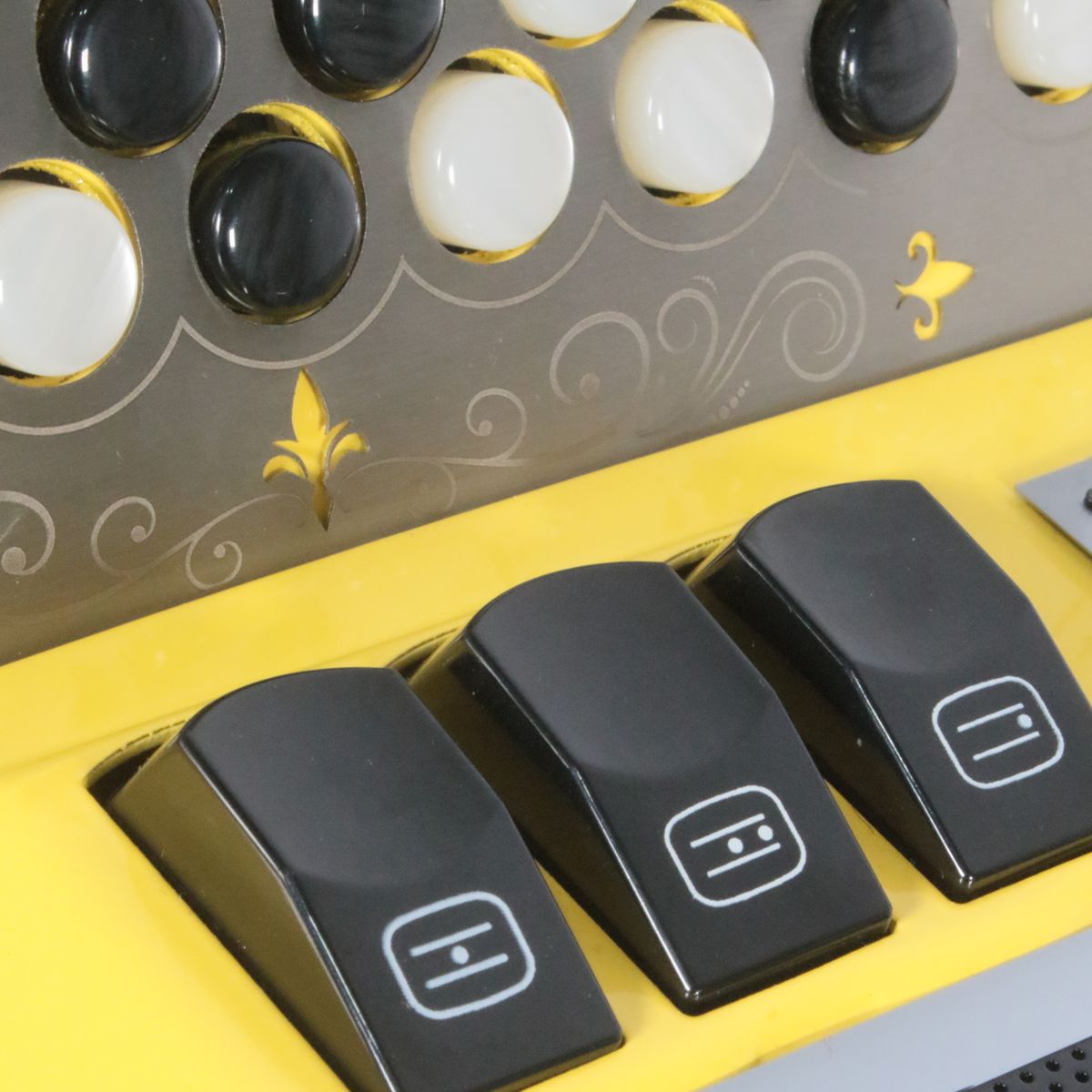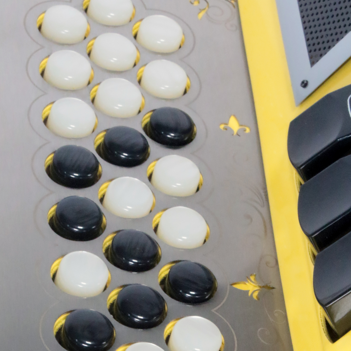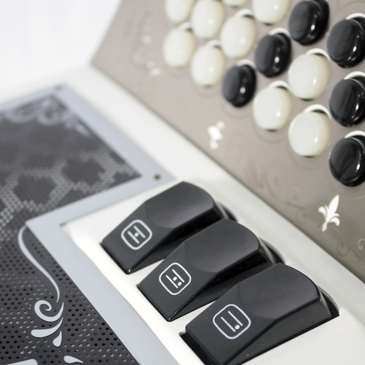Acordeón de botones, tono de Sol, 34 botones, 12 bajos, 3 registros, pintado, parrilla original de acero inoxidable, diapasón con botones aperlados y diseño original, partes internas mejoradas, ornamentación floral y de pedrería, placas metálicas con diseño original en sección de bajos y agudos, correas de tela y funda de nylon.