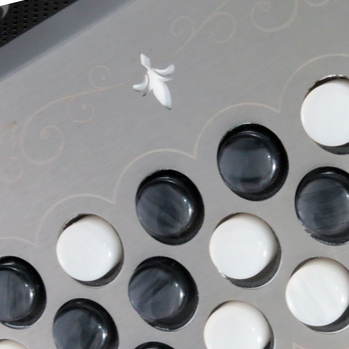 Acordeón de botones, tono de Fa, 31 botones, 12 bajos, pintado, parrilla original de acero inoxidable, diapasón con botones aperlados y diseño original, partes internas mejoradas, ornamentación floral y de pedrería, placas metálicas con diseño original en sección de bajos y agudos, correas de tela y funda de nylon.