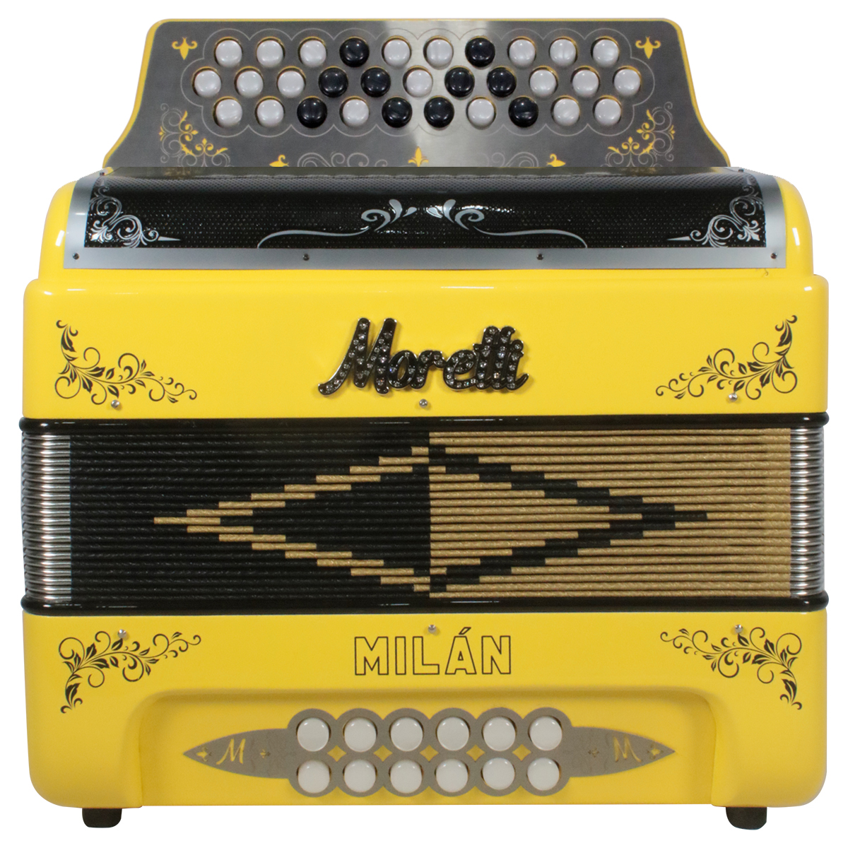 Con el nuevo acordeón Milan de Moretti, tendrás en tus manos un gran sonido, una resonancia natural y toda la experiencia en la fabricación de acordeones. Es ideal para diversos géneros musicales y cuenta con exclusivos diseños que te harán brillar en el escenario. Moretti cuenta con un excelente control de calidad, por lo que tus instrumentos están elaborados con el mayor cuidado y el mejor sonido que podrás encontrar en acordeones en este rango de precio.