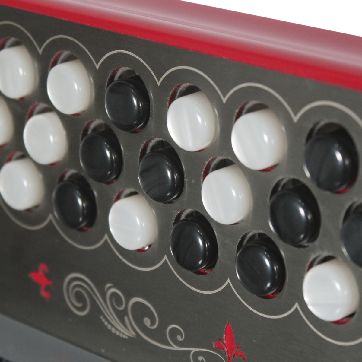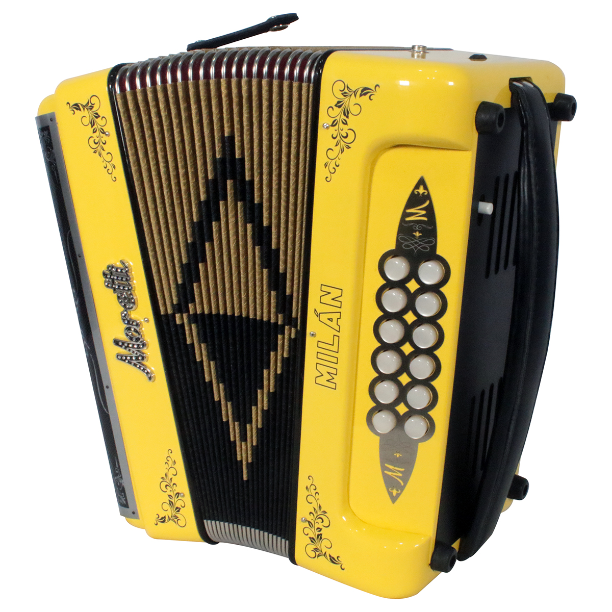 Acordeón de botones, tono de Sol, 31 botones, 12 bajos, pintado, parrilla original de acero inoxidable, diapasón con botones aperlados y diseño original, partes internas mejoradas, ornamentación floral y de pedrería, placas metálicas con diseño original en sección de bajos y agudos, correas de tela y funda de nylon.