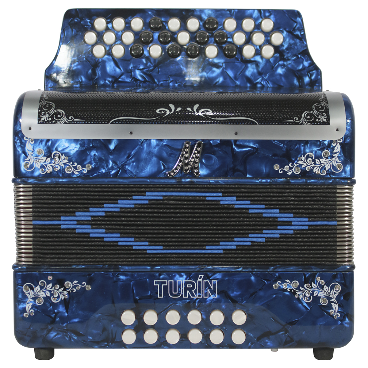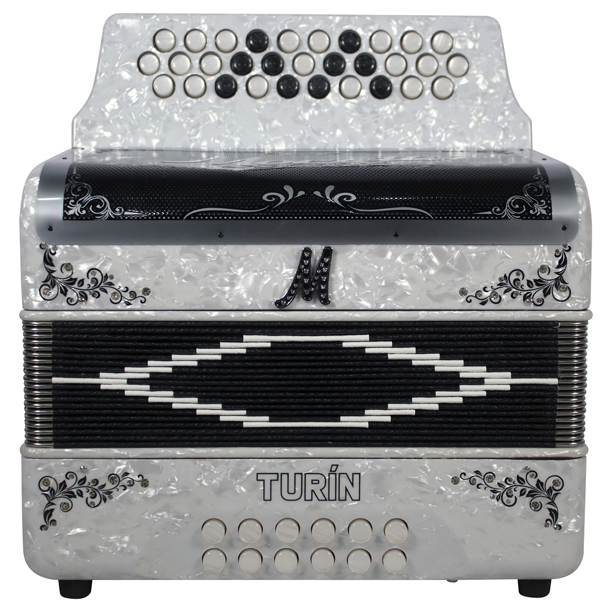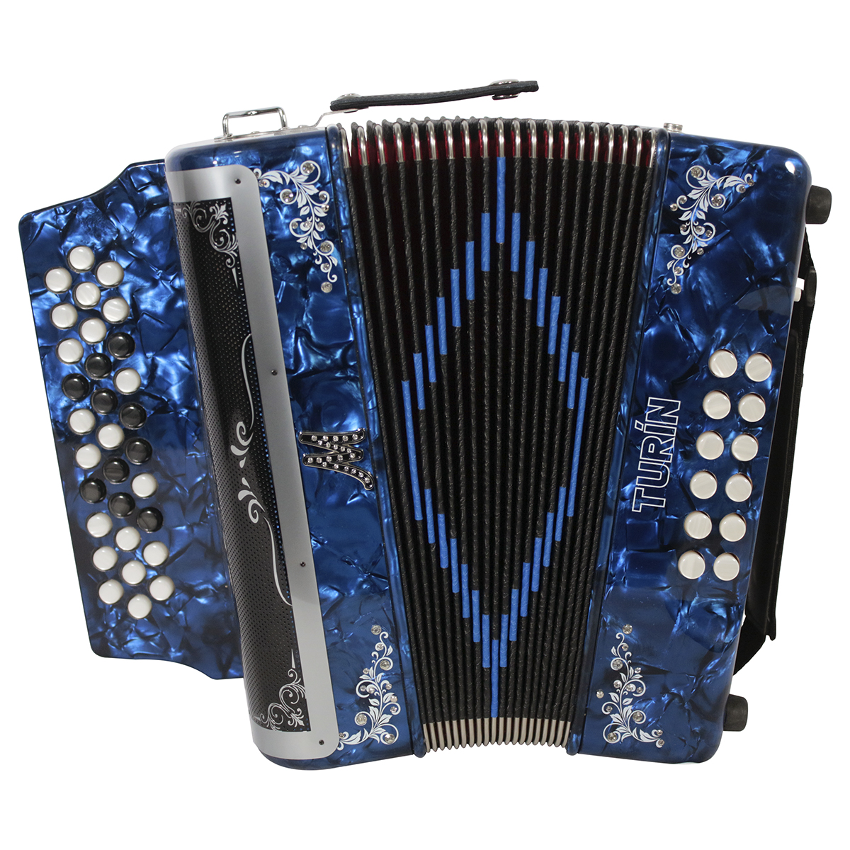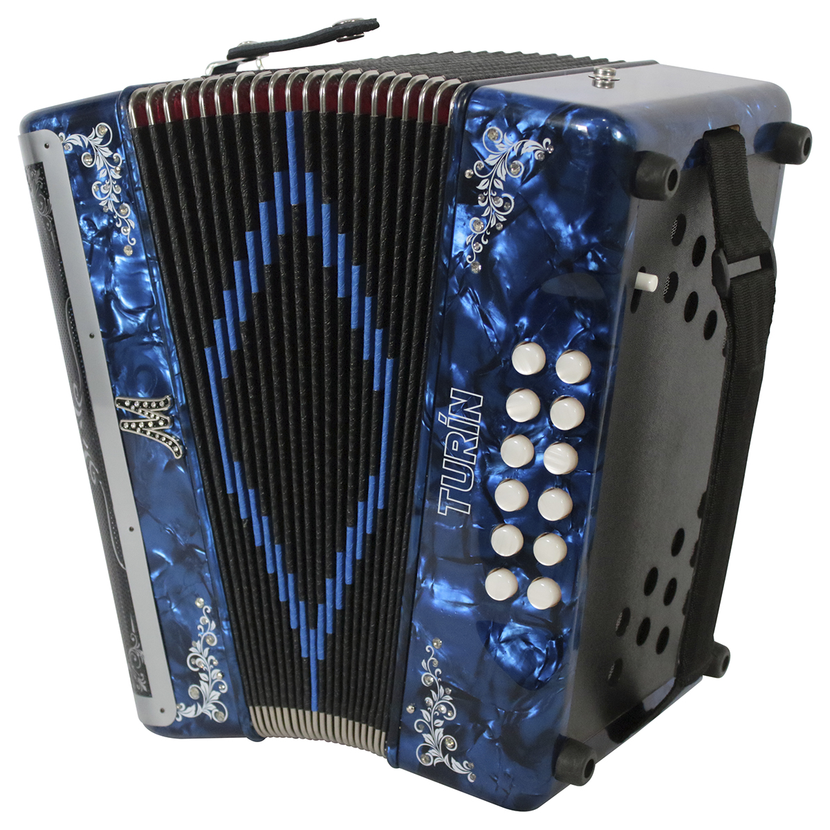 Acordeón de botones, tono de Sol, 31 botones, 12 bajos, de celuloide, parrilla original de acero inoxidable, diapasón con botones aperlados y diseño original, partes internas mejoradas, ornamentación floral y de pedrería, correas de tela y funda de nylon.