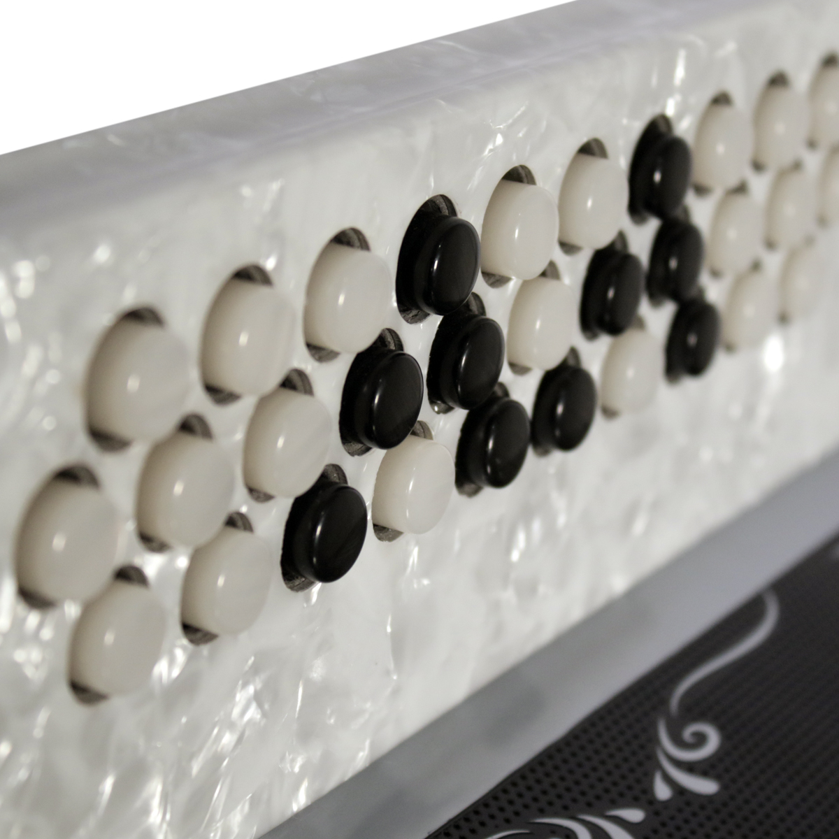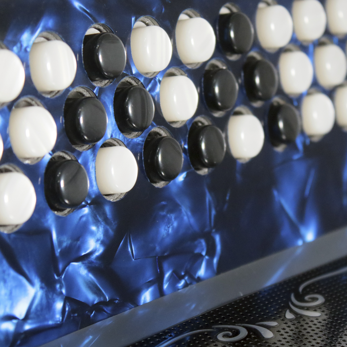 Diapasón con botones aperlados y diseño original.
