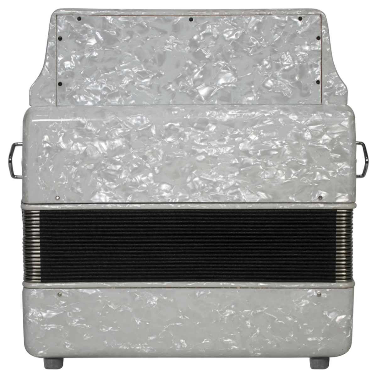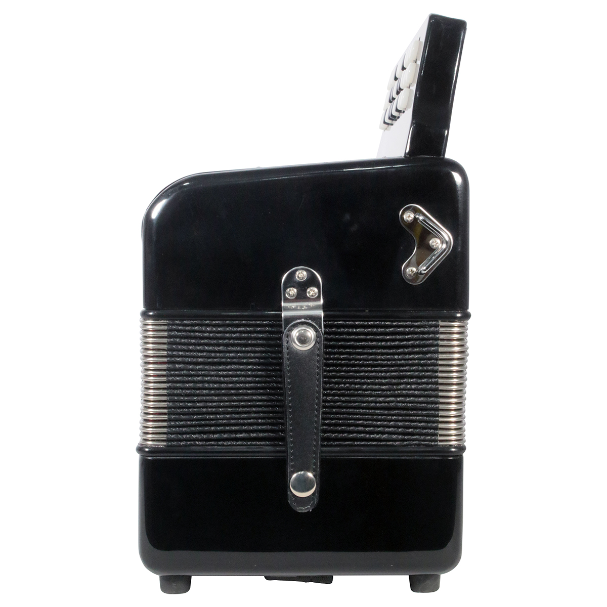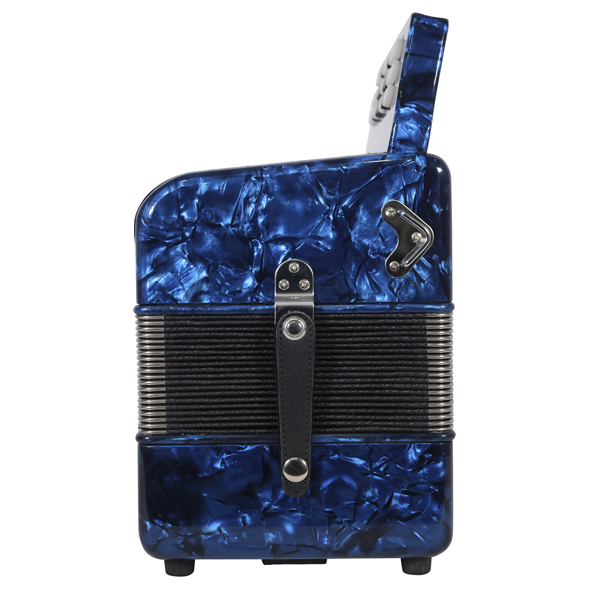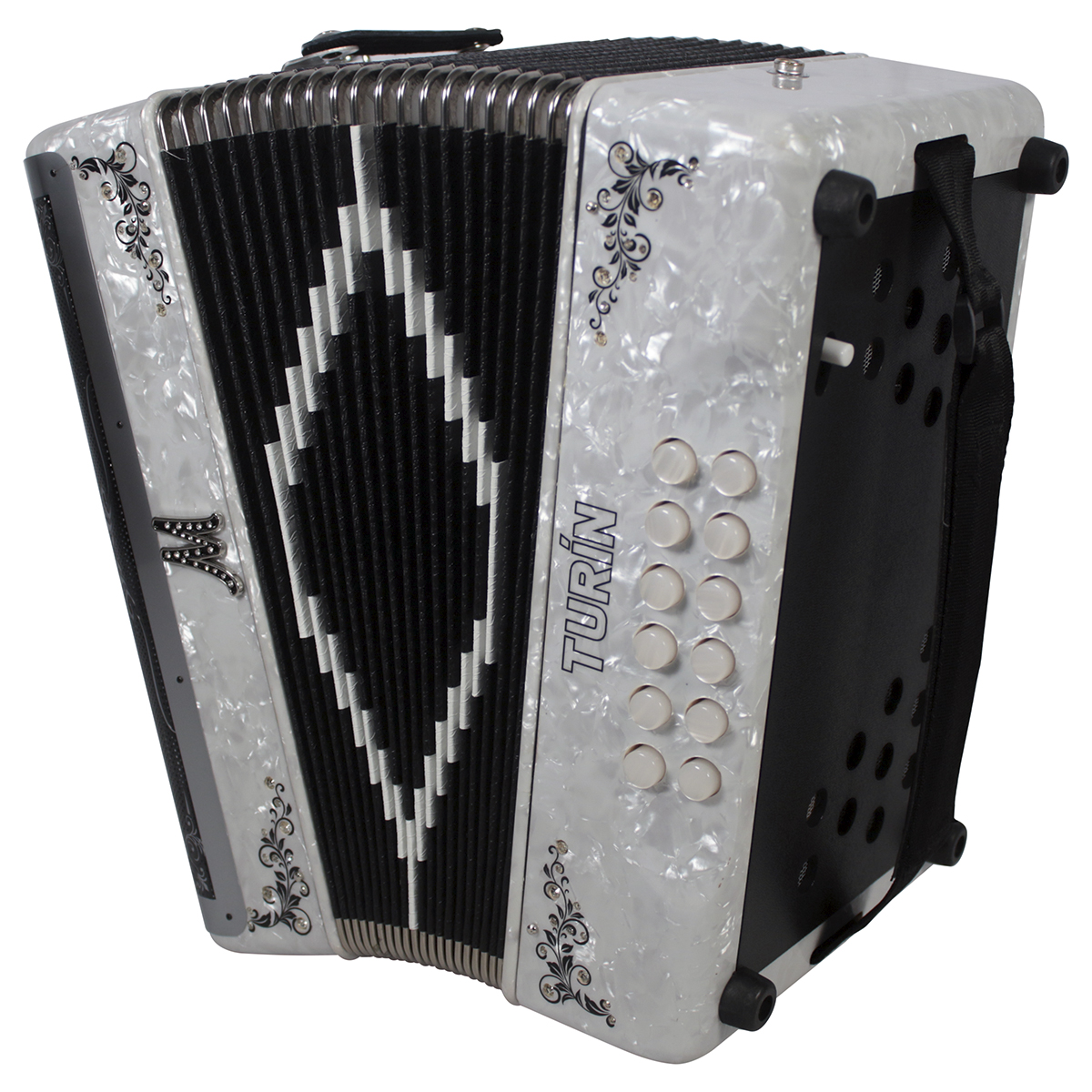 Acordeón de botones, tono de Sol, 31 botones, 12 bajos, de celuloide, parrilla original de acero inoxidable, diapasón con botones aperlados y diseño original, partes internas mejoradas, ornamentación floral y de pedrería, correas de tela y funda de nylon.
