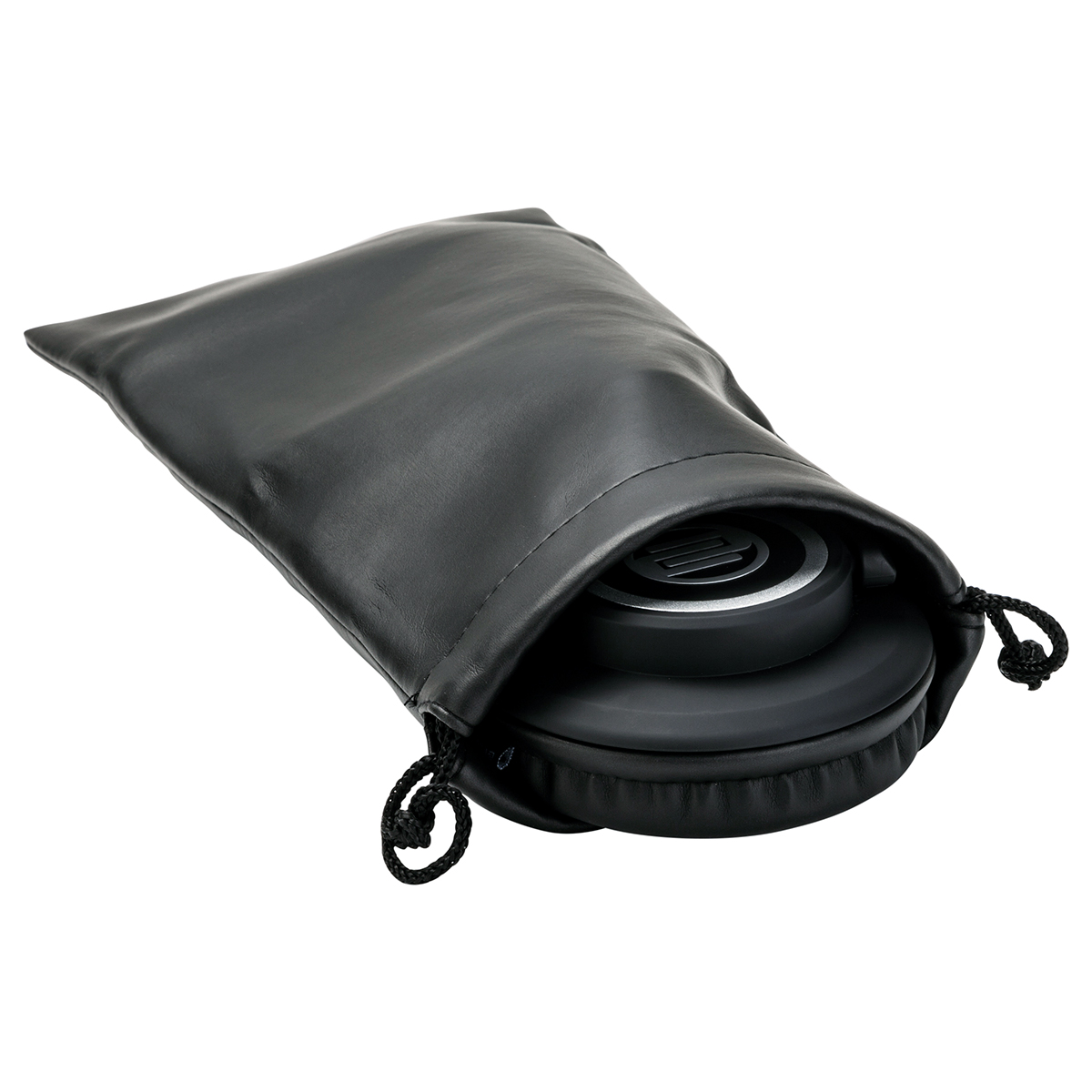 Cable y bolsa grande de cuero artificial para audífonos y accesorios.