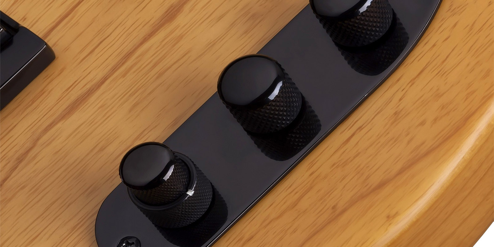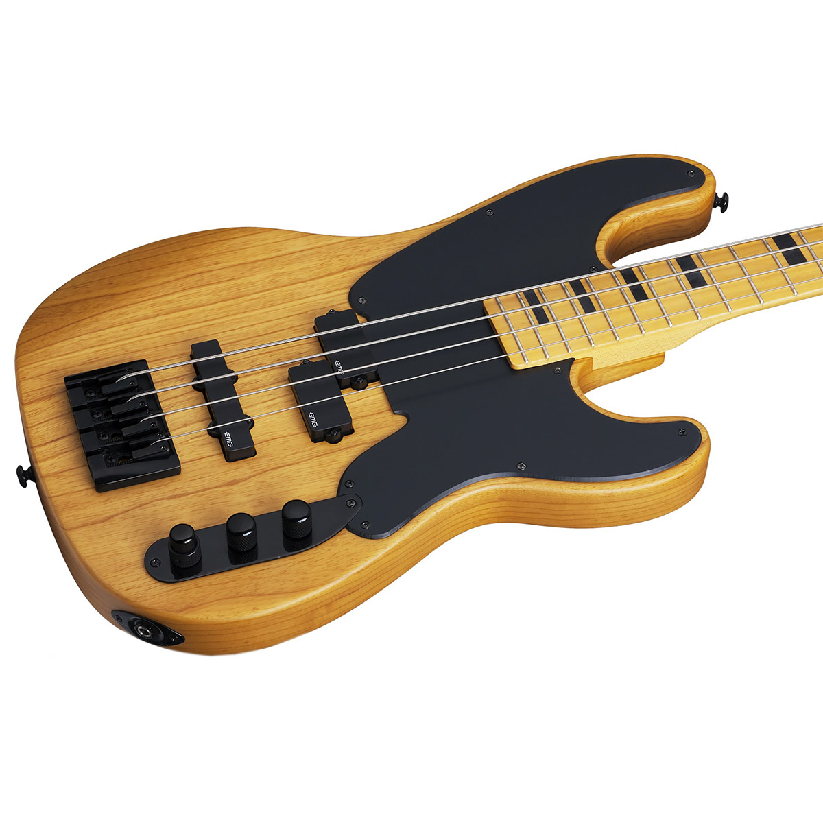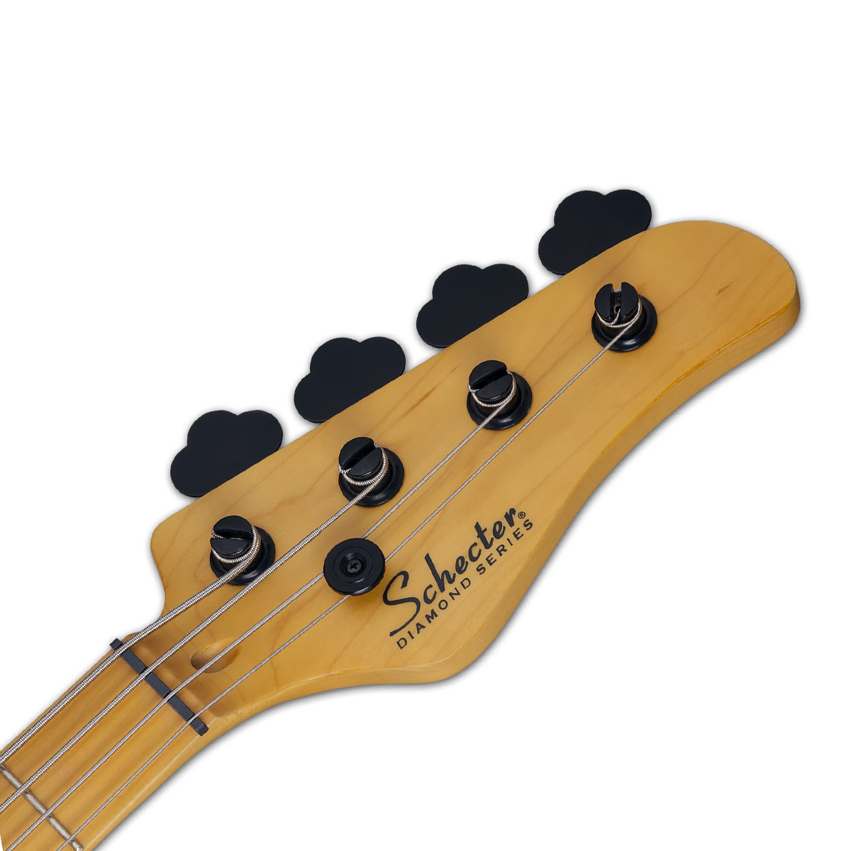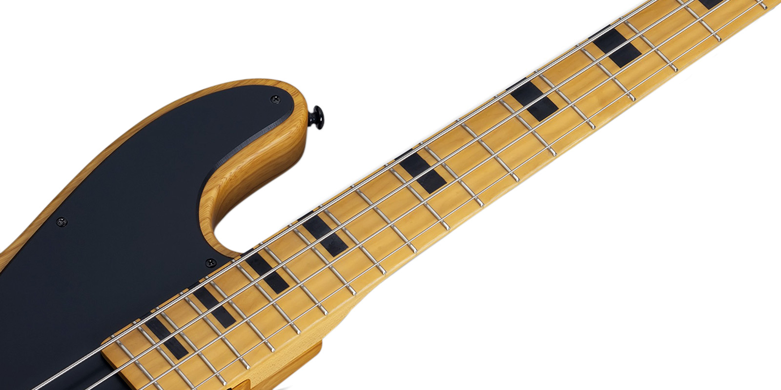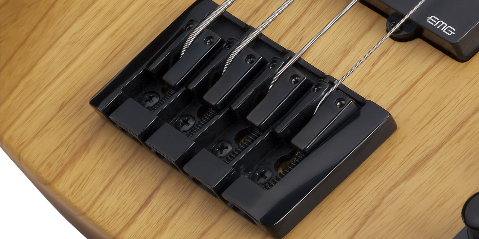 22 Trastes X-Jumbo y radio del diapasón: 12″ (305 mm), tuerca: Graph Tech XL Black Tusq y ancho de la tuerca: 1,653″ (42 mm), Truss Rod: Varilla ajustable de 2 vías con tuerca Allen de 5/32″ (4 mm), con color de los herrajes: negro, tipo de destreza diestro y puente Schecter Custom Bass String Thru (o carga superior), controles Master Volume/Blend/2-Band EMG Active E/Q, pastilla del puente: EMG J