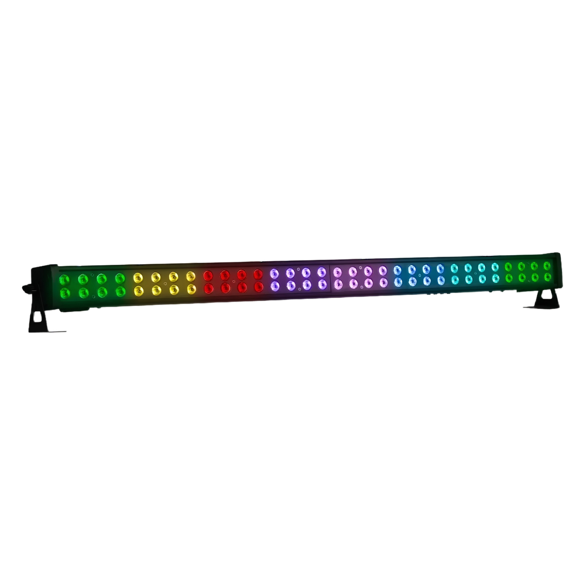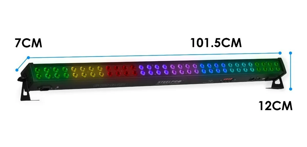 La Barra LED Steelpro Mod. 642-BAR es un sistema de iluminación de alto rendimiento diseñado para cubrir grandes áreas con colores vibrantes. Equipada con 64 emisores LED de 2 vatios, el modelo 642-BAR ofrece una mezcla de color RGB fluida y una proyección de gran alcance. Cuenta con múltiples canales DMX para un control detallado, así como modos automáticos y audiorítmicos para aplicaciones más sencillas. Su estructura robusta y disipación de calor optimizada la convierten en la opción perfecta para bañar paredes (wall washing) en salones de eventos, escenarios teatrales o fachadas, brindando una atmósfera profesional y moderna.