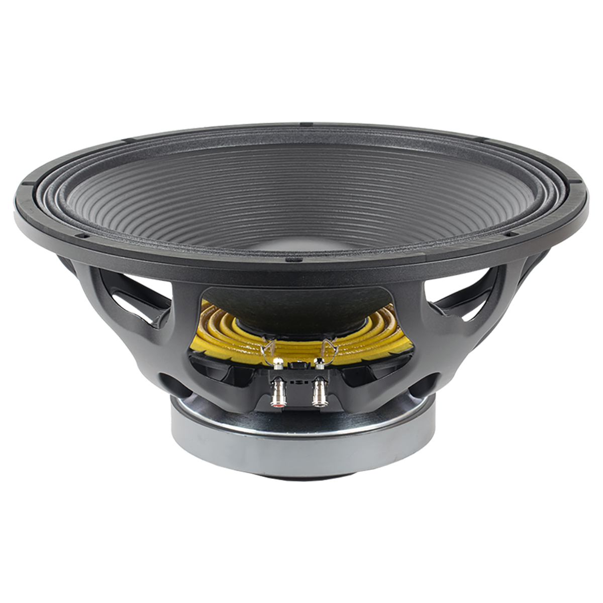 anillo demodulador de aluminio, ruido de aire ultra bajo, comportamiento lineal optimizado, membrana NCR exclusiva (refuerzo de acoplamiento de cuello), cono resistente a la intemperie con tratamiento por ambos lados, doble araña de silicona, bobina móvil de cobre de entrada / salida DUO de 4″ pulgadas, desplazamiento extendido controlado: Xmax ± 13 mm, Excursión pico a pico de 60 mm antes del daño, Optimizado para aplicaciones de subwoofer de paso de banda radiación directa.