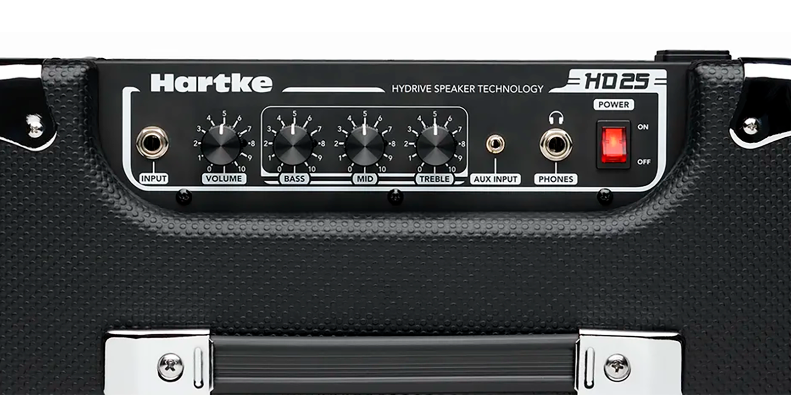 El HD25 es un combo de bajo compacto de 25W con altavoz HyDrive de 8″ (papel y aluminio), ecualizador de 3 bandas, entrada auxiliar, salida de auriculares y limitador integrado, ideal para práctica y pequeños ensayos.