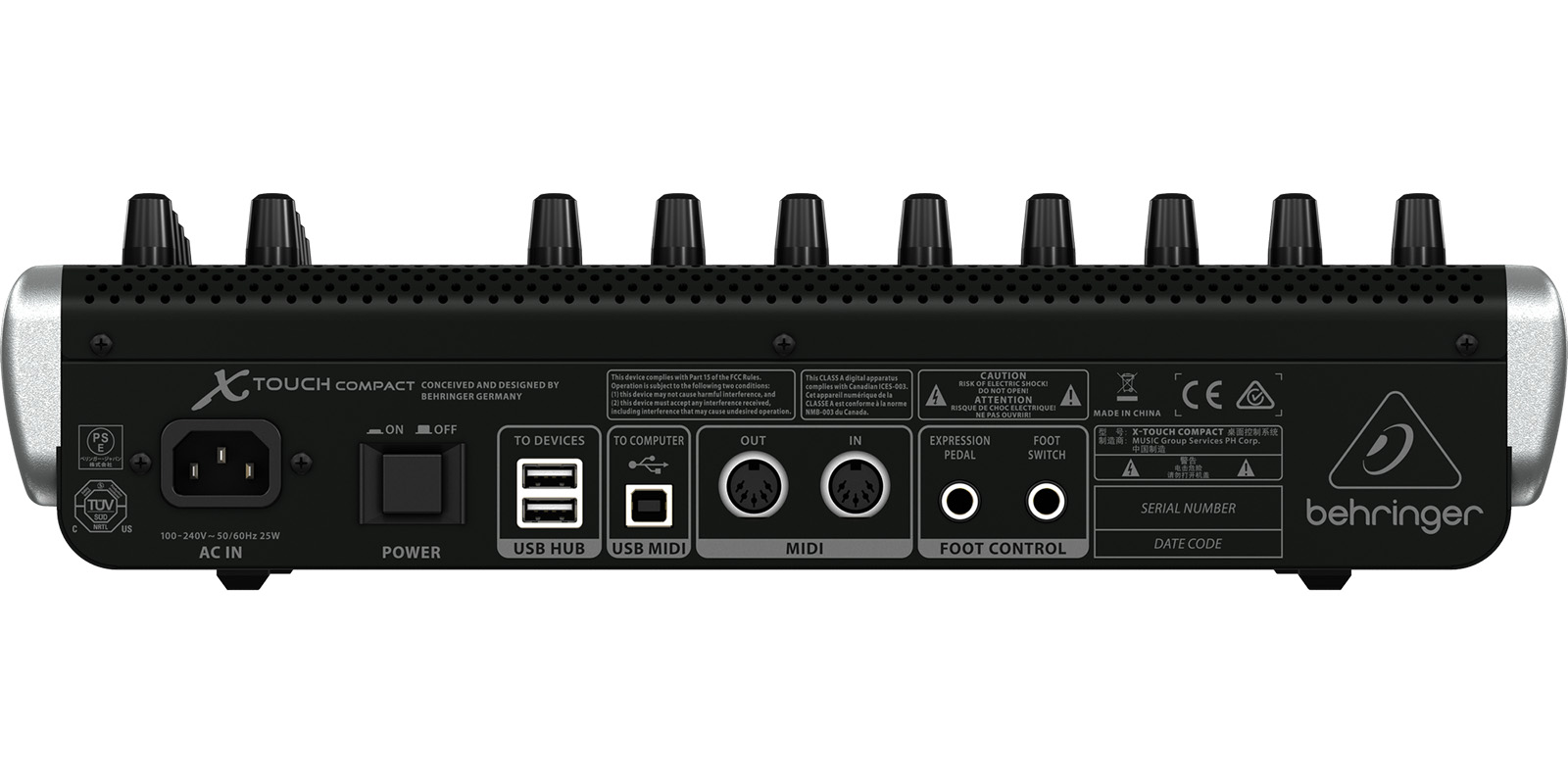 Equipado con 16 controles giratorios con collares LED que proporcionan una lectura visual en color ámbar con 39 botones iluminados para hacer al X-TOUCH COMPACT una fiesta para tus ojos. Ofrecen acceso directo a funciones preconfiguradas o teclas de función mapeadas por el usuario. Un color brillante si el canal está muteado o en solo y puedes ver cómo está el nivel cuando se realizan los cambios durante la grabación o mezcla. Arma varias pistas o ajusta el paneo al mismo tiempo y maravíllate de algo en o que jamás confiaste que hiciera tu mouse o controlador. La interface USB integrada te permite conectar el X-TOUCH COMPACT directamente a tu Mac o PC sin necesidad de utilizar drivers.El controlador universal USB X-TOUCH COMPACT de Behringer te proporciona un control preciso sobre tu DAW favorito, instrumentos, efectos y sistemas de iluminación con la fluidez de 9 faders motorizados sensibles al tacto y totalmente automatizados, 16 codificadores giratorios con collares LED y 39 botones iluminados. Libérate del paradigma del click del mouse con ajustes preconfigurados X-TOUCH’s o personaliza tus propias configuraciones para dominar el arte de realizar ajustes sobre la marcha como nunca antes.