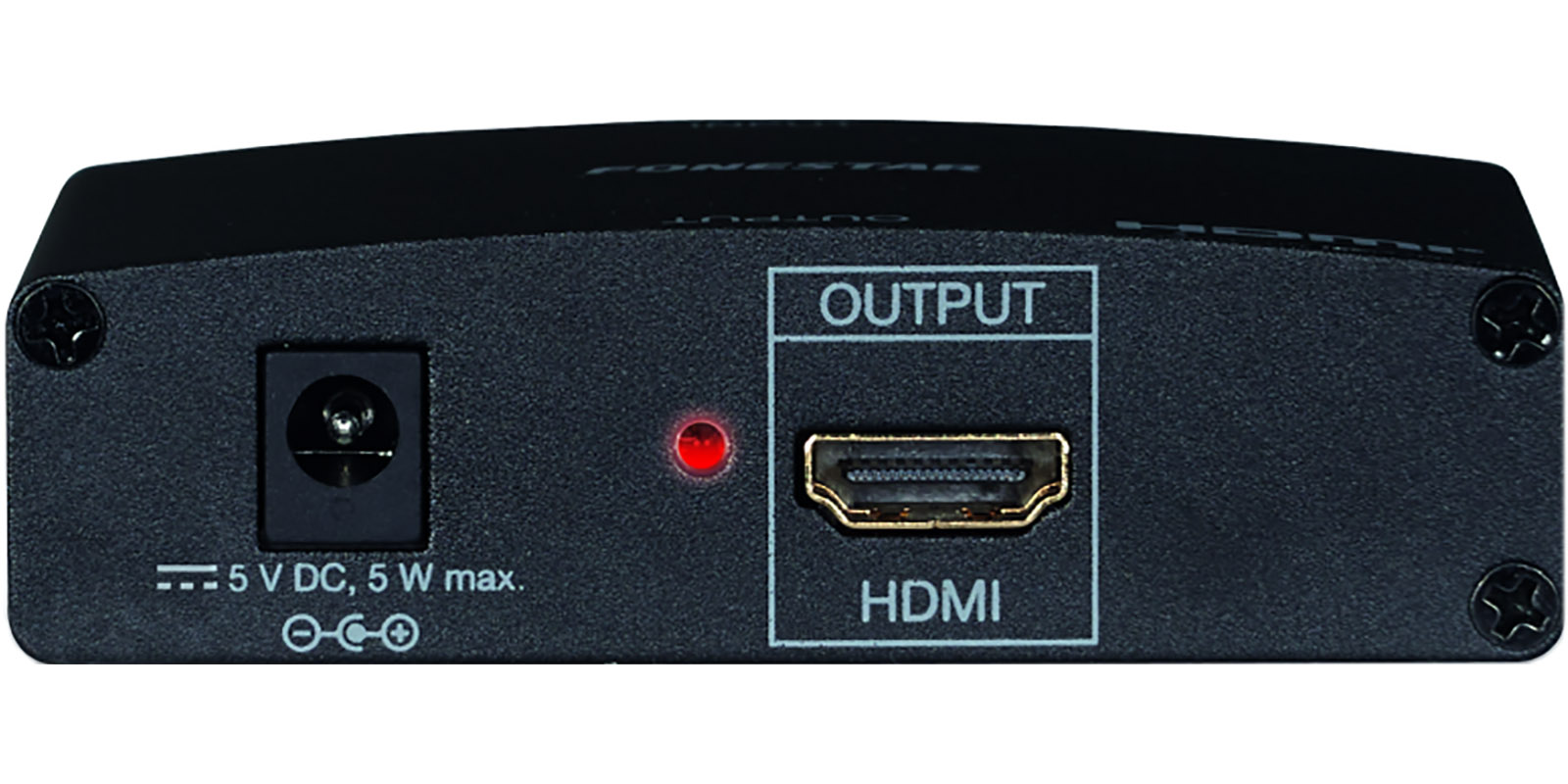 Convertidor de VGA a HDMI, permite la conexión de un PC a una pantalla con entrada HDMI, convierte una señal VGA y una entrada de audio estéreo en una señal HDMI, resolución máxima: 1280 x 1024 (SXGA), ancho de banda del amplificador de HDMI 1.65 Gbps / 165 MHz por canal (6.75 Gbps todos los canales), entradas: 1 VGA 0’5-1 Vpp (DDC 5 Vpp TTL), 1 auxiliar, 2 x RCA , salidas: 1 HDMI hembra conectordorado, indicador luminoso de encendido e indicador luminoso de modo compatible,formatos admitidos: 800 x 600 60/75 Hz, 1024 x 768 60/75 Hz, 1280 x 720 60/75 Hz, 1280 x 768 60/75 Hz, 1280 x 960 60 Hz, 1280 x 1024 60/75 Hz, alimentación: 5V CC, 5 W máximo con adaptador incluido, dimensiones: 88 x 25.5 x 68 mm, peso: 0.2 kg.