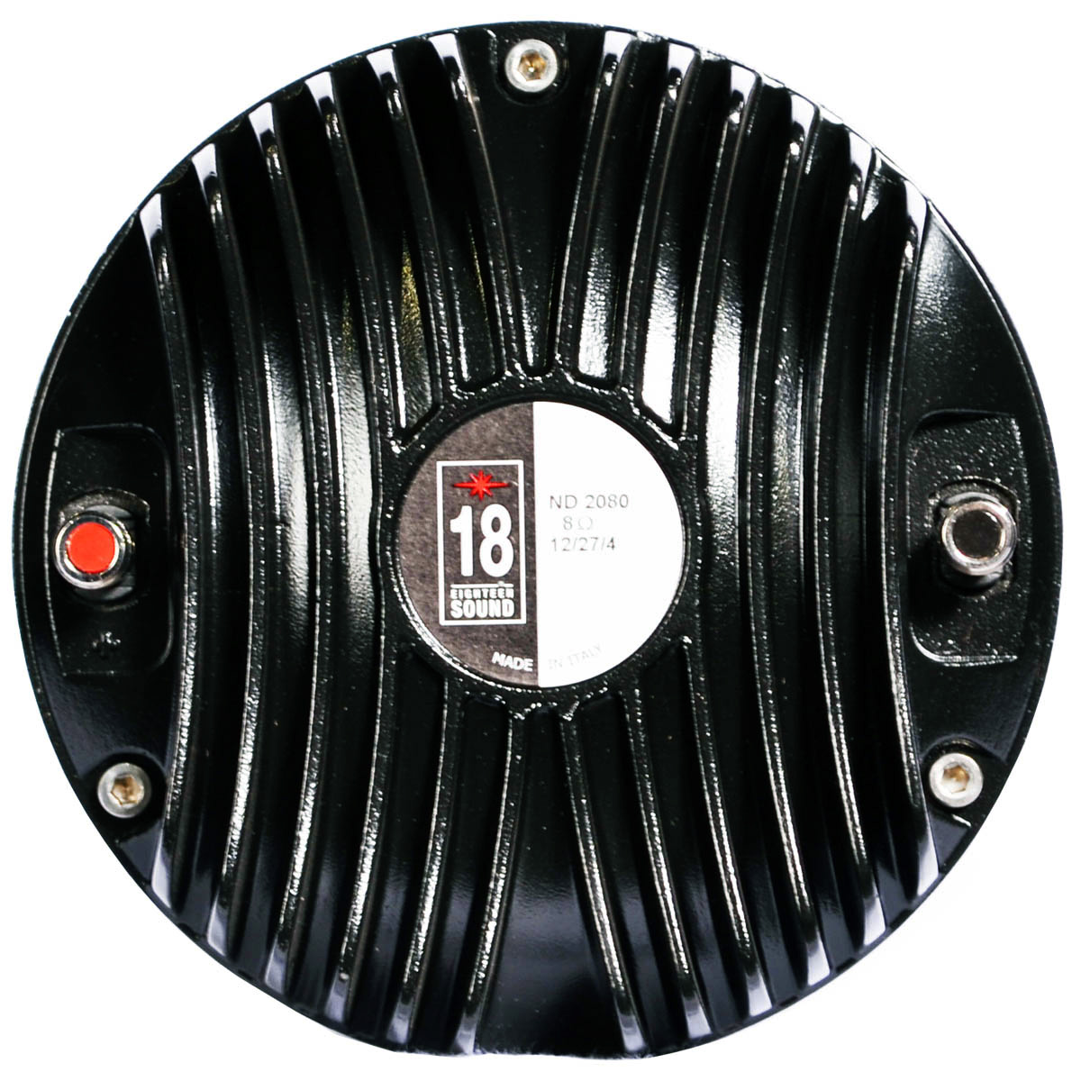 El driver de compresión de alta frecuencia ND2080 de 2″ pulgadas ha sido diseñado para aplicaciones de sistemas de sonido de alta calidad. El diafragma de titanio es producido internamente por Eighteen Sound y se ha desarrollado para garantizar una respuesta transitoria inigualable. El ensamblaje del diafragma se realiza al unir el embobinador directamente a la cúpula de titanio en su borde de doblez superior. En comparación con un embobinador de junta recta habitual, el diseño del driver asegura una transferencia de energía de frecuencia extendida para una linealidad de respuesta mejorada y una confiabilidad sin paralelo. Esta característica permite un adecuado control del movimiento del domo en condiciones reales de trabajo. Se utiliza un embobinador de Nomex tratado patentado, ya que Nomex muestra un valor 30% más alto de alargamiento por tracción a una temperatura operativa de trabajo (200°C) en comparación con Kapton. Además, este material embobinador patentado, también es adecuado para su uso en entornos con mayor contenido de humedad. El poderoso ensamble de imán de neodimio ND2080 ha sido diseñado para obtener 22 KGauss en el entrehierro para mayores beneficios en la respuesta transitoria. La estructura del motor, a lo largo del plug de fase precisamente coherente con 3 ranuras circunferenciales y anillo de cobre en la pieza polar, reduce el efecto de inductancia y la distorsión. Los cuatro conductos de aire de la placa superior han sido diseñados para actuar como una cámara de carga para el diafragma, implementando distorsiones mid-band y figuras de respuesta. La junta tórica diseñada a medida, crea un sello hermético entre la placa y la cubierta, que asegura la carga de la cámara de aire. La excelente disipación de calor y el intercambio térmico están garantizados por el contacto directo entre la estructura magnética y la cubierta de aluminio, lo que conduce a un menor valor de compresión de potencia. Debido al uso cada vez mayor de sistemas de audio de alta potencia en eventos al aire libre o en entornos marinos, la capacidad del equipo para funcionar correctamente en condiciones climáticas adversas, es una característica clave de la filosofía de Eighteen Sound. Por lo tanto, se aplica un tratamiento especial al imán y las placas superior y posterior de la estructura magnética que hacen que el driver sea más resistente a los efectos corrosivos de las sales y la oxidación. Este tratamiento es más efectivo que cualquier otro tratamiento utilizado por otros fabricantes.
