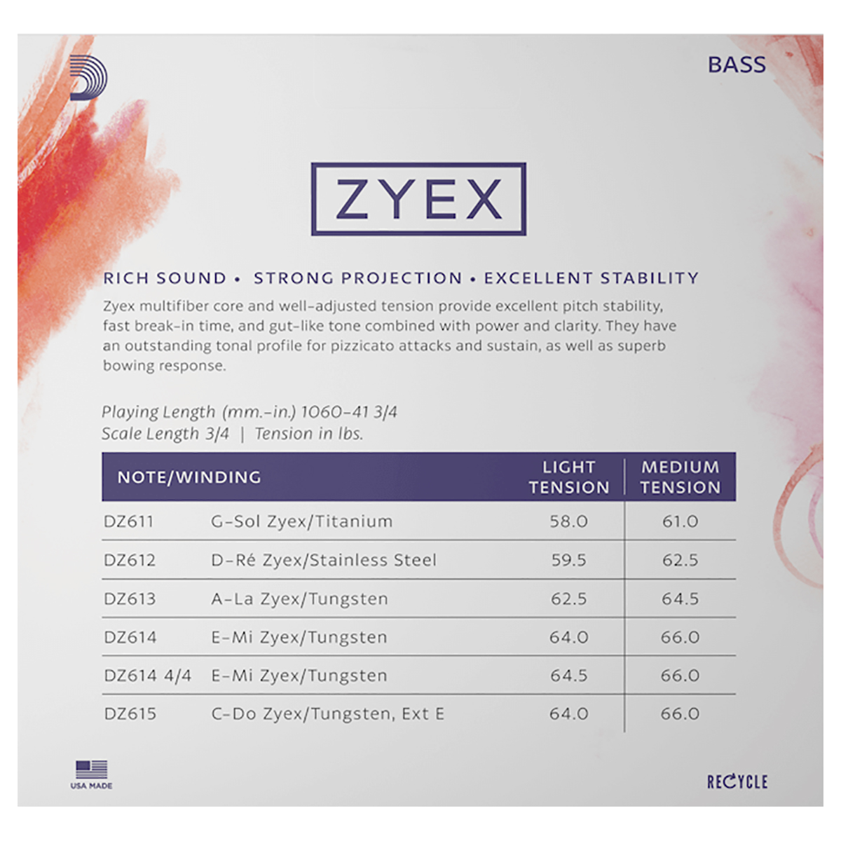 Juego de cuerdas Zyex de D’Addario para contrabajo, escala 3/4, tensión media, aptas para contrabajos de 3/4 con una longitud de 41 3/4 pulgadas (1,060 mm), núcleo sintético Zyex, sonido extremadamente cálido y profundo, material sintético de última generación, increíblemente estables en condiciones climáticas adversas, ataques de pizzicato y efectos sostenidos sobresalientes, excelente respuesta del arco.