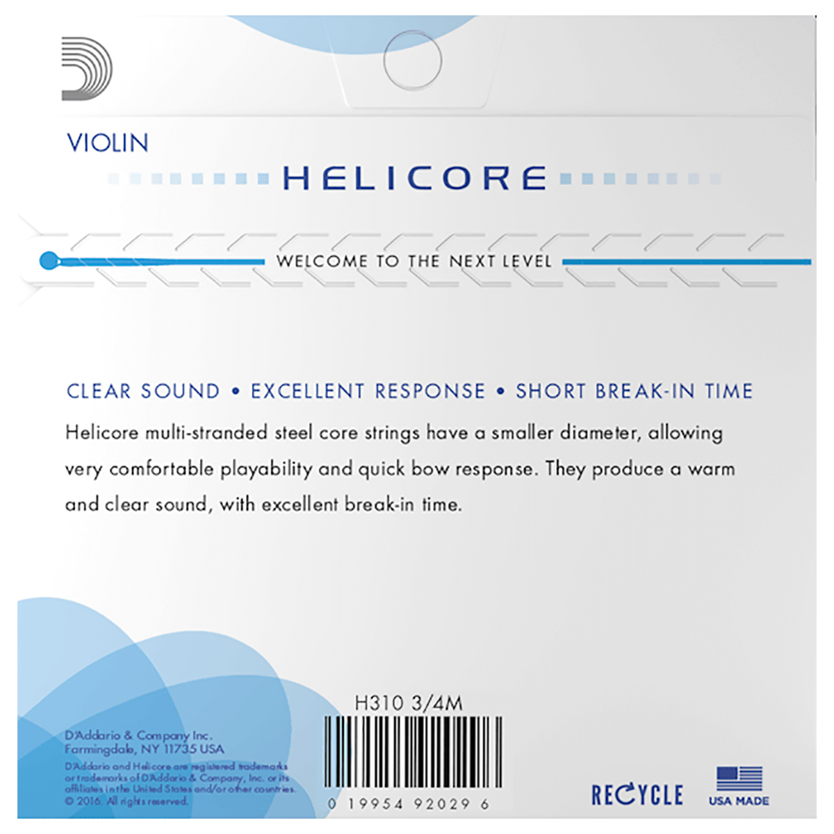 Las cuerdas Helicore de D’Addario para violín están hechas a mano con un núcleo de acero multi-hebra, lo que resulta en una óptima facilidad de toque mientras produce un tono cálido y claro. El diámetro más pequeño de cuerda ofrece una respuesta rápida. Los materiales de primera calidad combinados con una mano de obra calificada producen cuerdas para una excelente estabilidad de tono y longevidad.