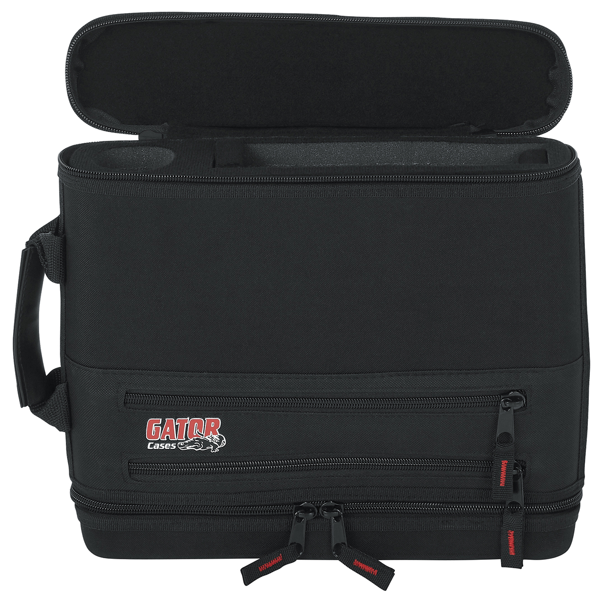 Este estuche para sistema inalámbrico es una bolsa de goma EVA delgada y rígida diseñada para transportar las unidades inalámbricas de medio rack de tamaño más comunes. Tiene acceso frontal y trasero que se descomprime para una fácil configuración y acceso con cierre para permitir que la antena esté en su lugar y sea funcional. Hay almacenamiento para un receptor, micrófono de mano, fuente de alimentación, transmisor bodypack y micrófonos de solapa. El estuche es llevado por un asa acolchada.