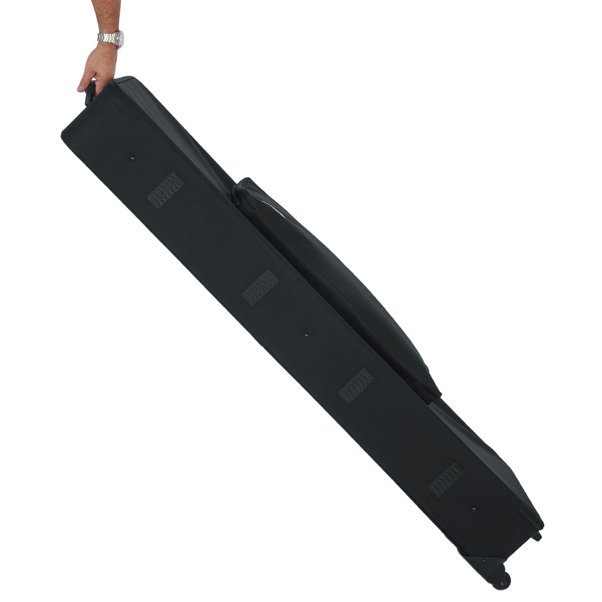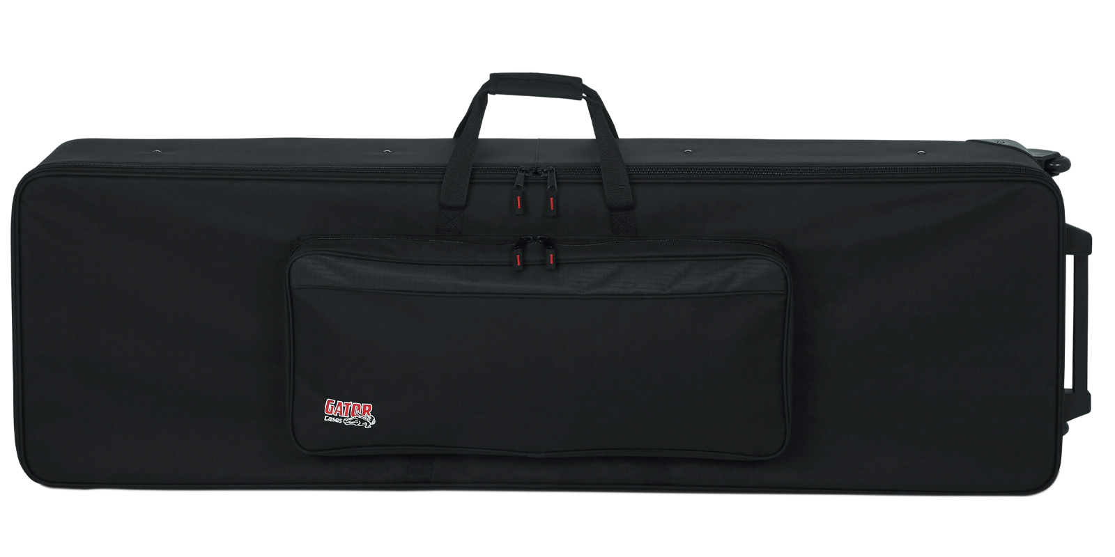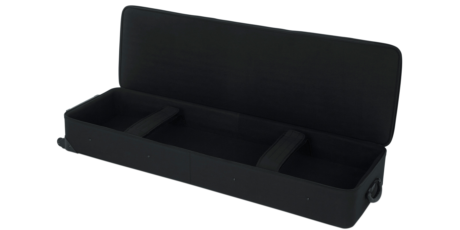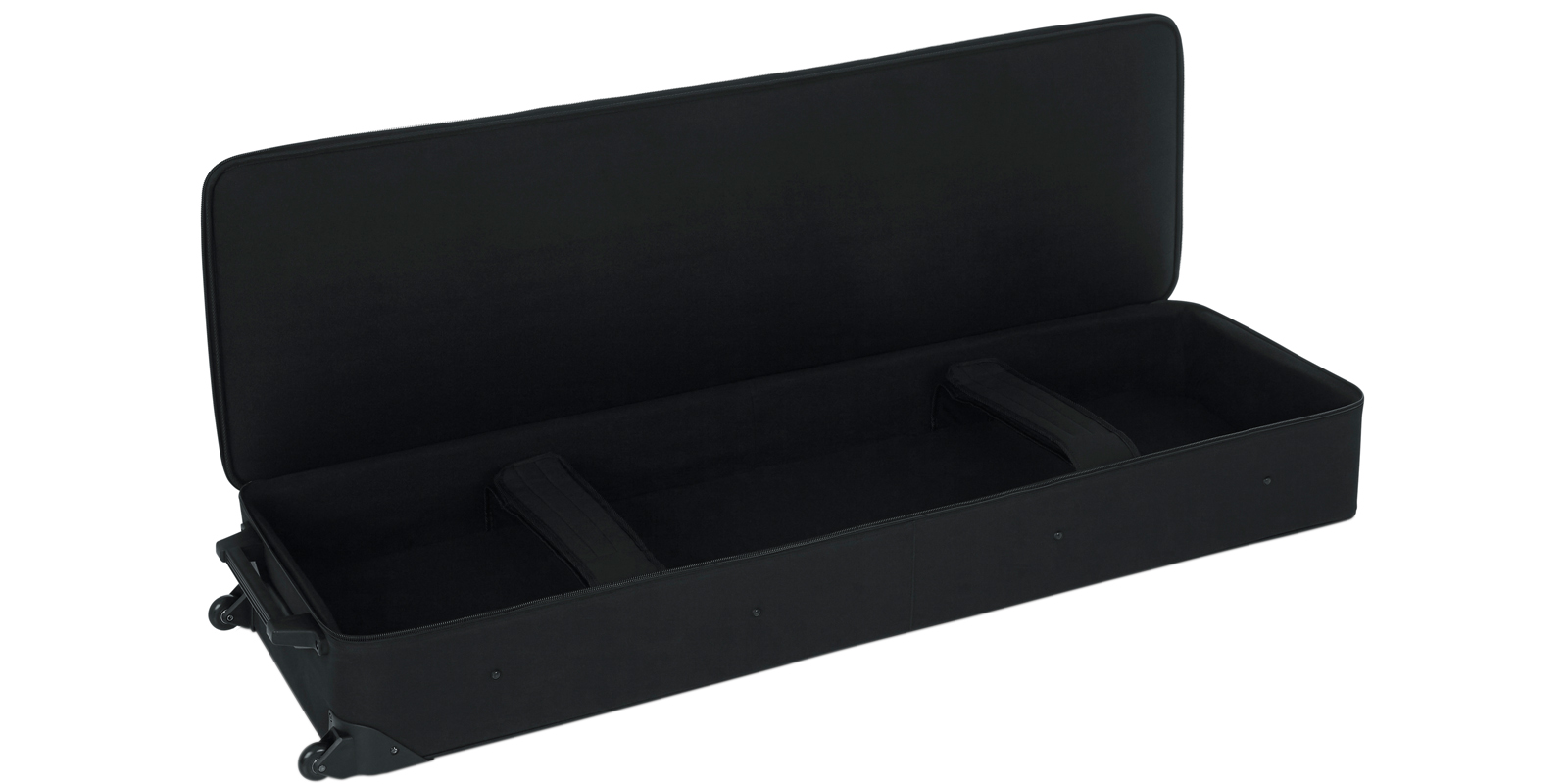 Estuche ligero para teclado de 88 teclas, fabricado con resistente nylon con marco interior reforzado con polietileno, interior forrado con tricot y espuma suave, correas acolchadas totalmente ajustables para asegurar el teclado en su lugar durante el transporte, grandes compartimentos para accesorios en el exterior para pedales y cables, ruedas integradas con manija de remolque y barras deslizantes.