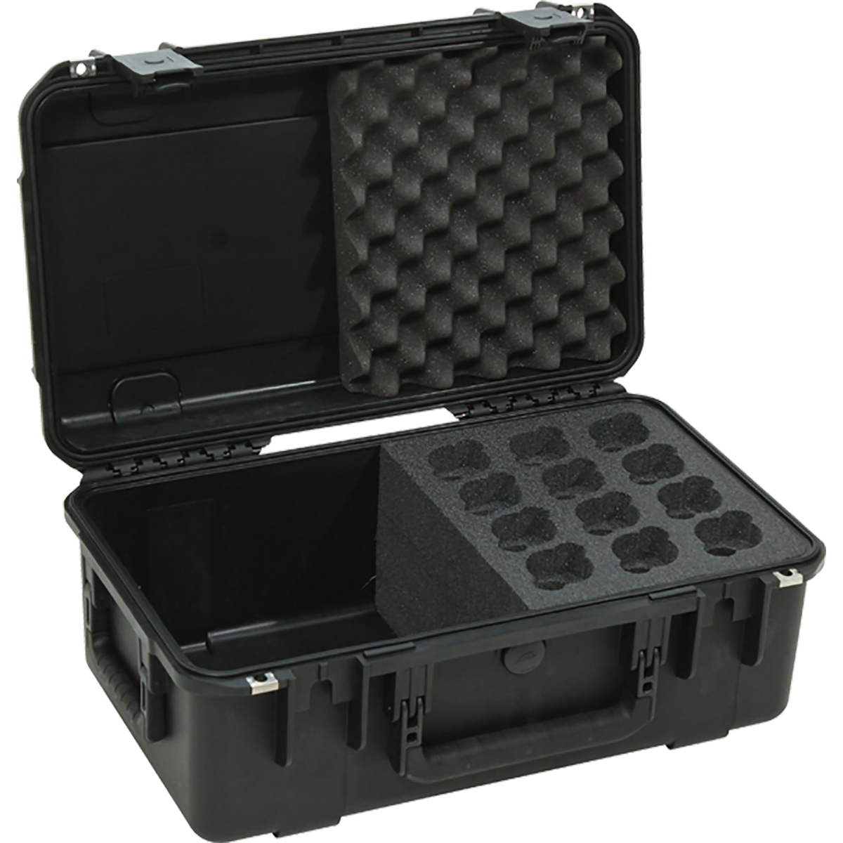 El estuche de micrófono 3I-2011-MC12 de SKB puede almacenar 12 micrófonos verticalmente y es parte de la línea iSeries de estuches a prueba de agua. Los agujeros para micrófono están diseñados para asegurar los tipos de micrófono de mano más populares, los cortes para dedo proporcionan un acceso instantáneo y cuenta también con un compartimento de almacenamiento para cables y ganchos. El interior está hecho de espuma de polietileno de alta calidad diseñado para mayor durabilidad. Este estuche mide 20″ x 11″ x 8″ pulgadas y está cubierto por la incondicional garantía de por vida de SKB. Los estuches impermeables moldeados por inyección están construidos con resina de copolímero de polipropileno de ultra alta resistencia y cuentan con un diseño con juntas, es impermeable, hermético, sumergible y resistente a los daños por impacto.