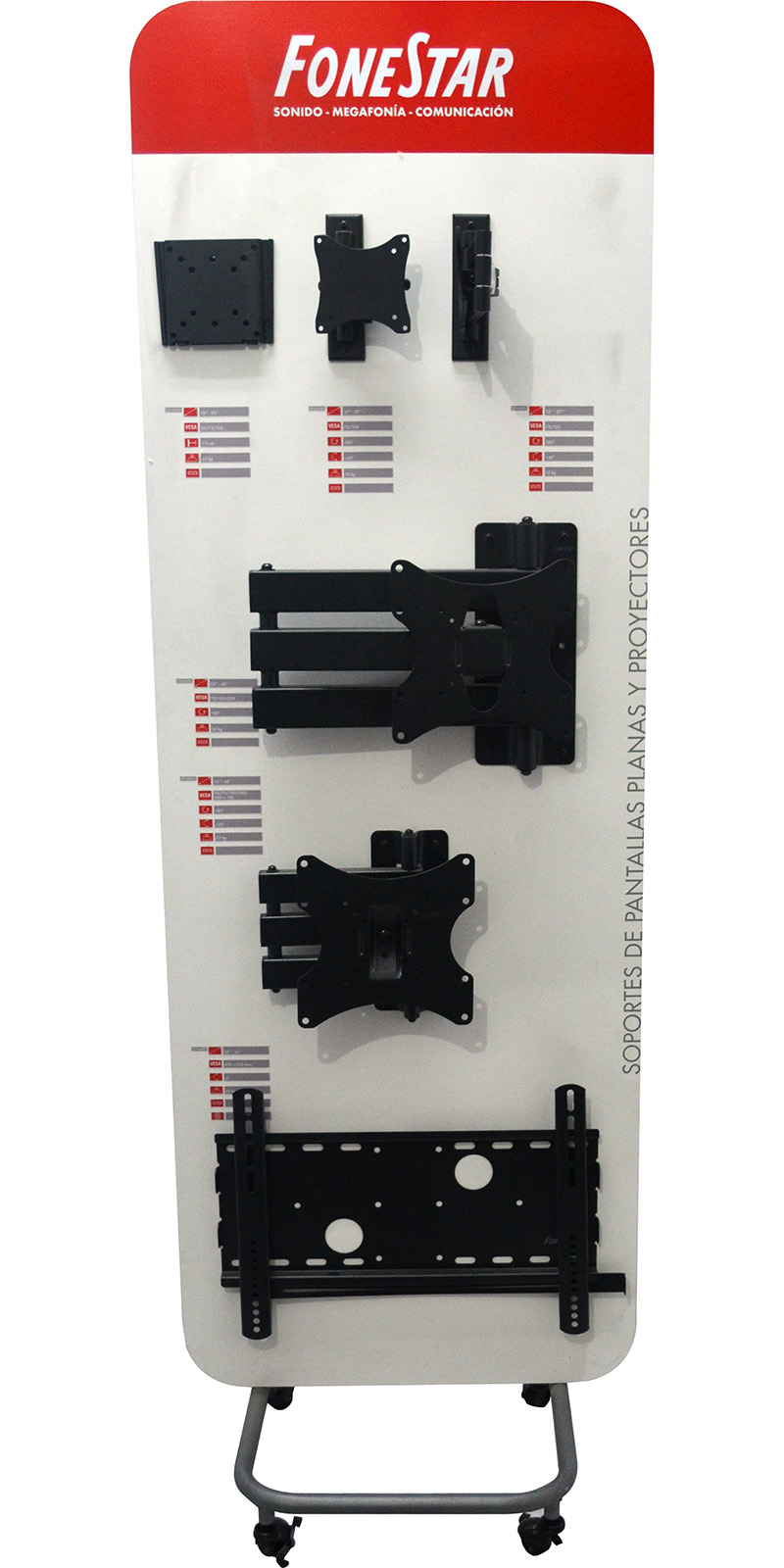 Exhibidor de pared para soportes de pantallas planas, altura: 1 metro, ancho: 0.7 metros, capacidad de 2 a 6 en función del tamaño, peso: 9.5 kg.