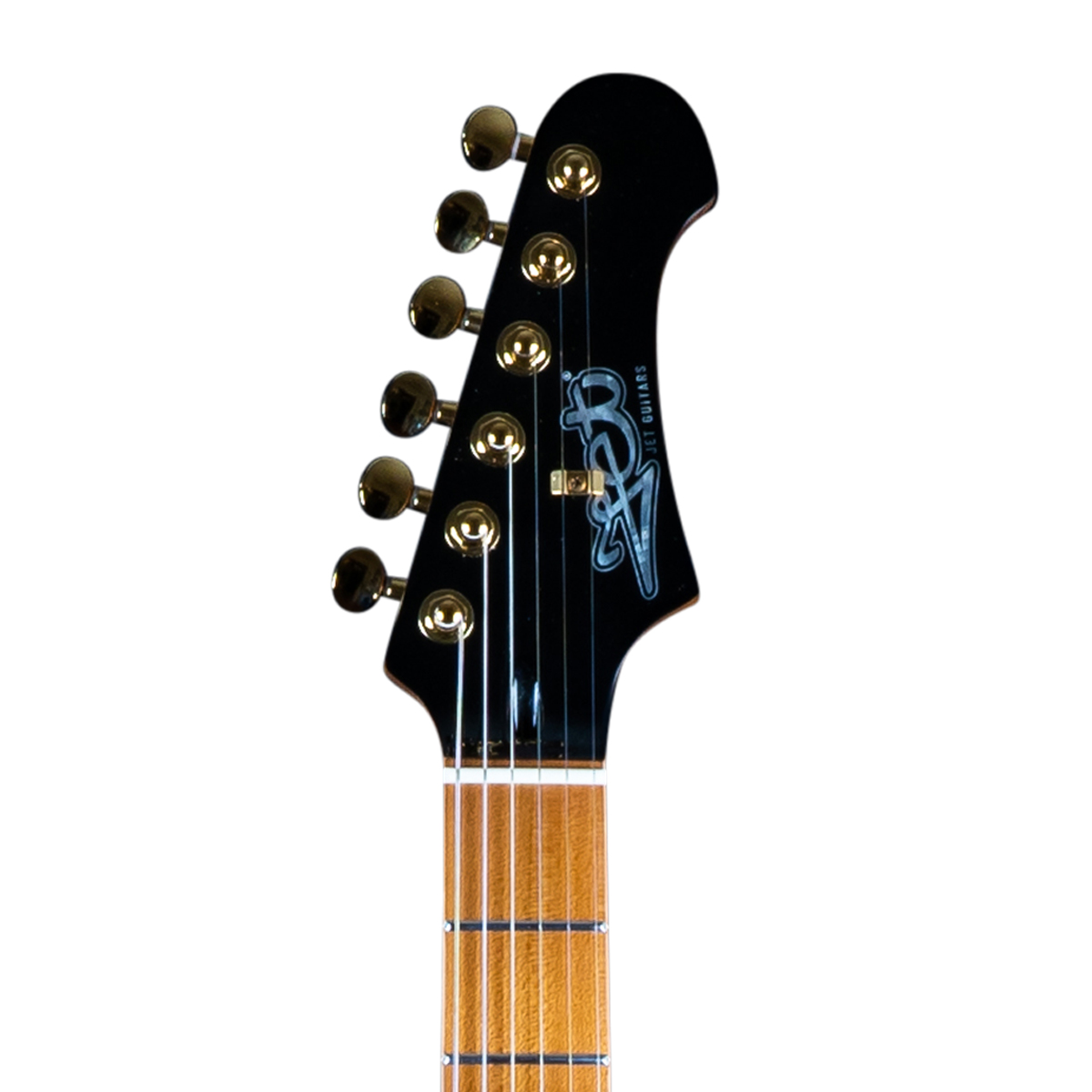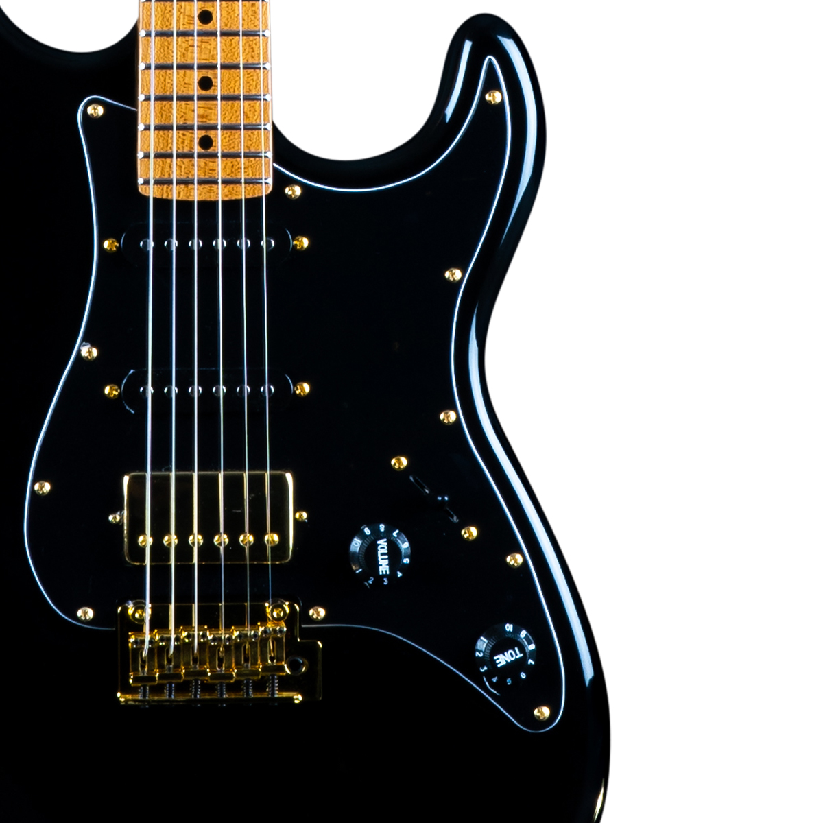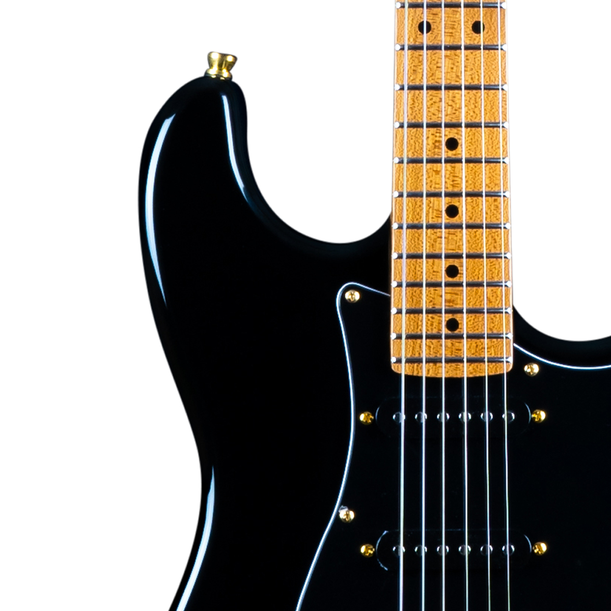 Hardware y Diseño: La guitarra está equipada con un sistema de trémolo de dos puntos que asegura una acción de vibrato suave y estable. El acabado Negro de alto brillo le da un toque profesional y minimalista que la hace destacar en cualquier colección.