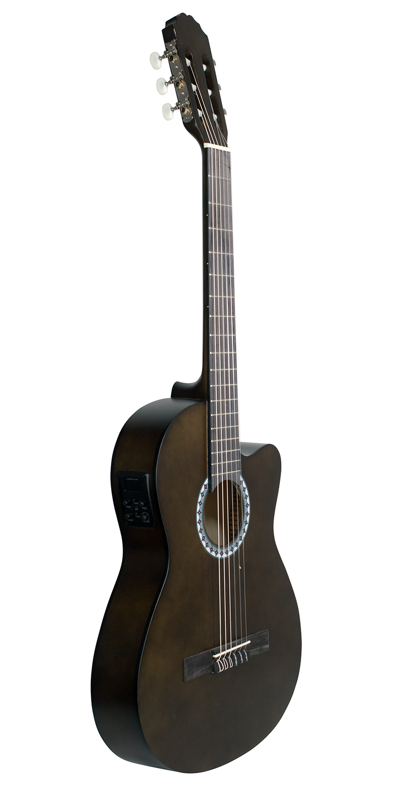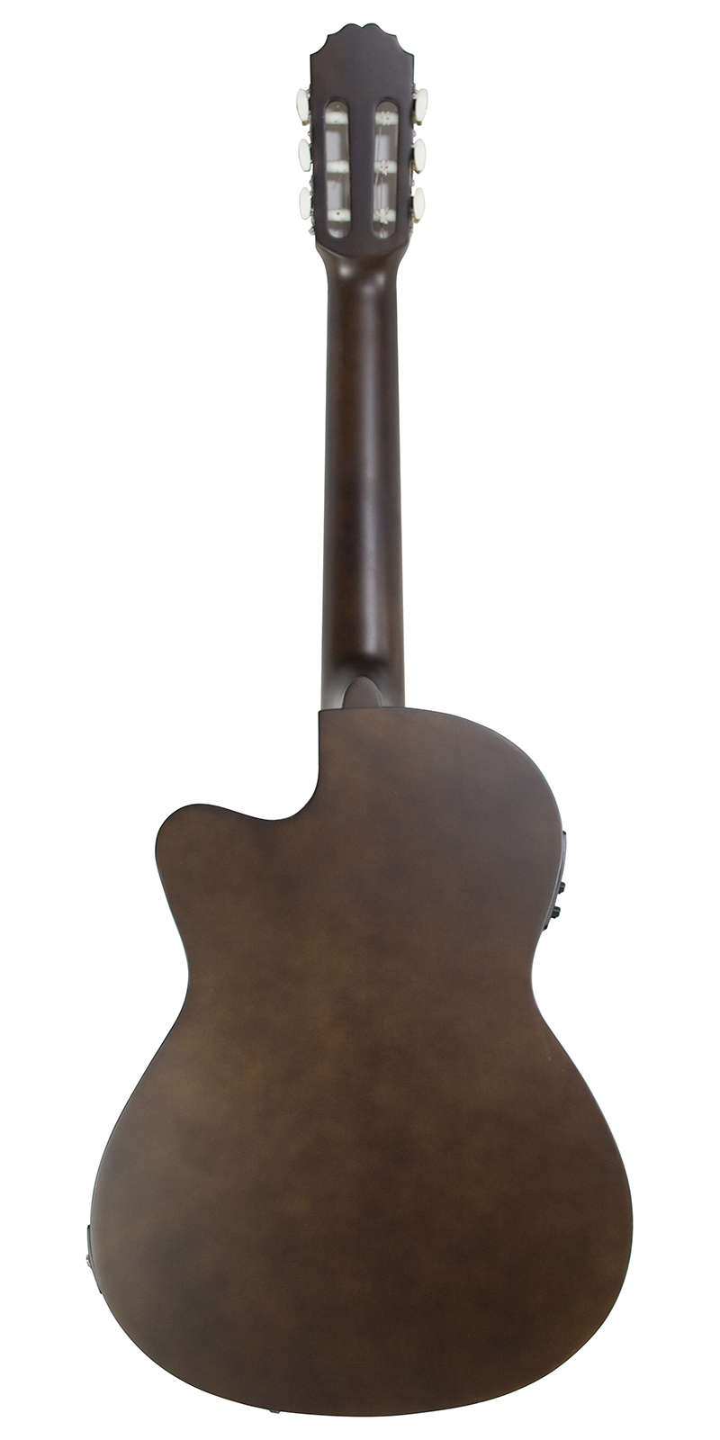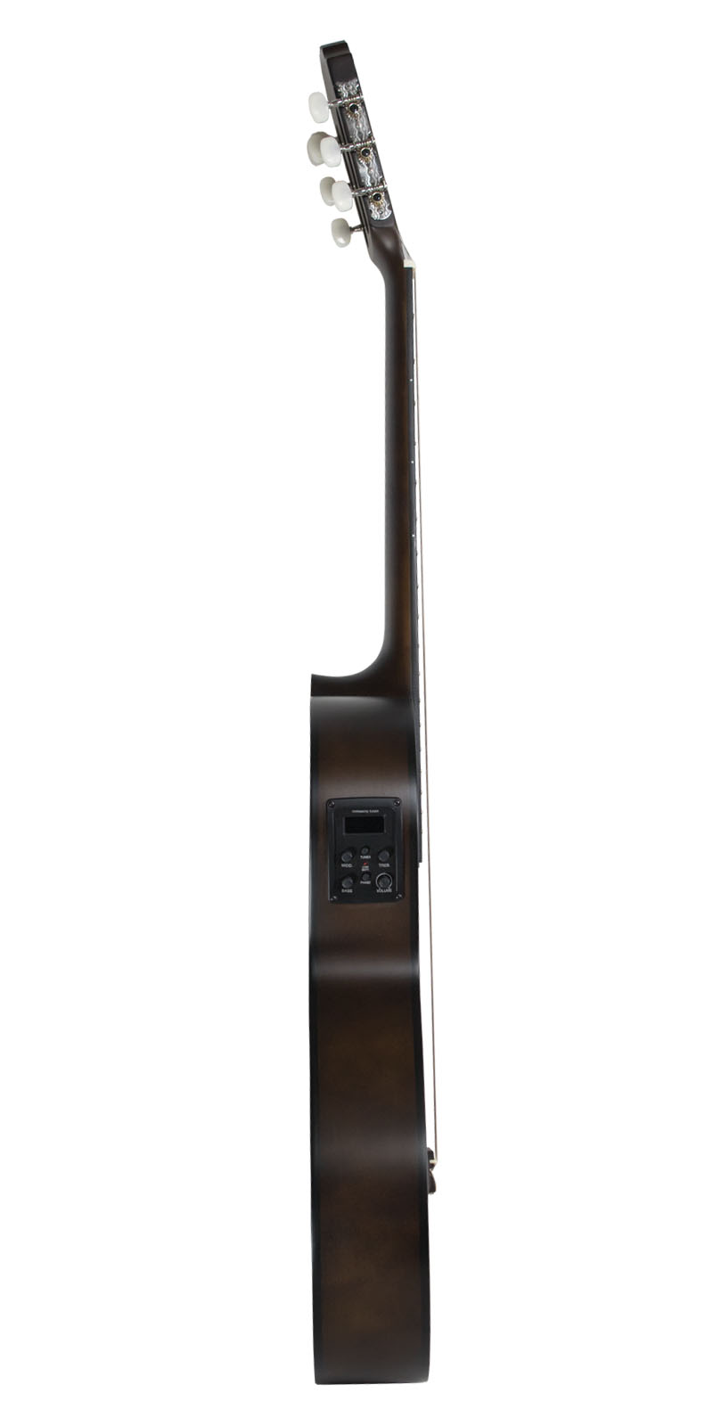 Guitarra clásica, resaque, escala 4/4” (650 mm), cuerpo de tilo, unión de ABS, diapasón y puente de madera de pakka, trastes de níquel plata, maquinaria cromada, terminado mate ecológico basado en agua, cejuela de 52 mm de ancho, pastilla piezo de puente con ecualizador de 4 bandas y afinador. Dimensiones del producto: 14 x 46 x 106 cm. Peso: 2.17 Kg.