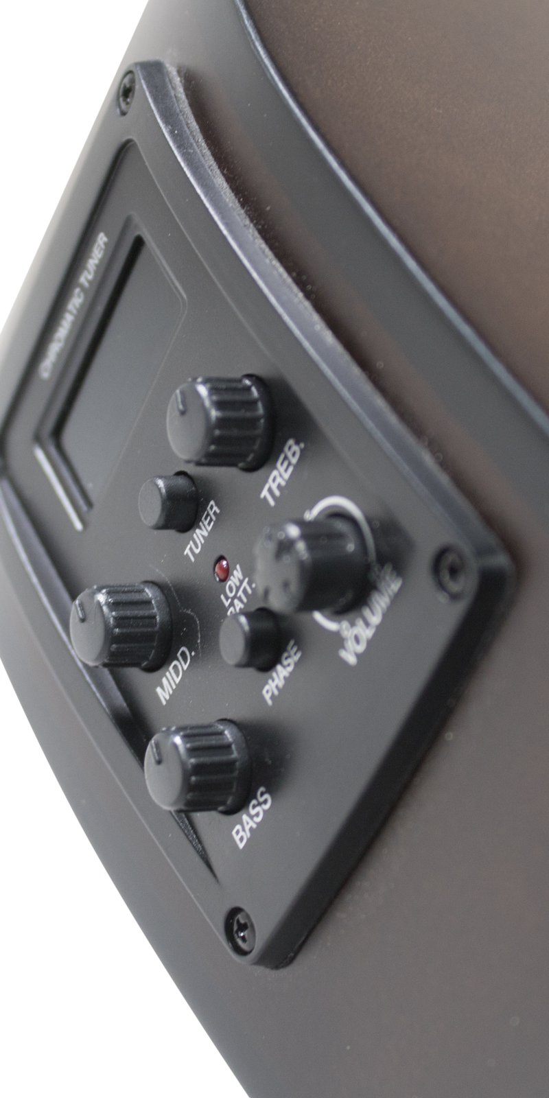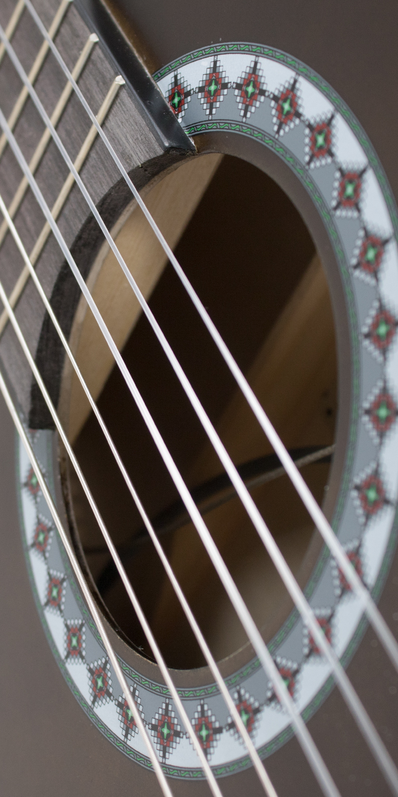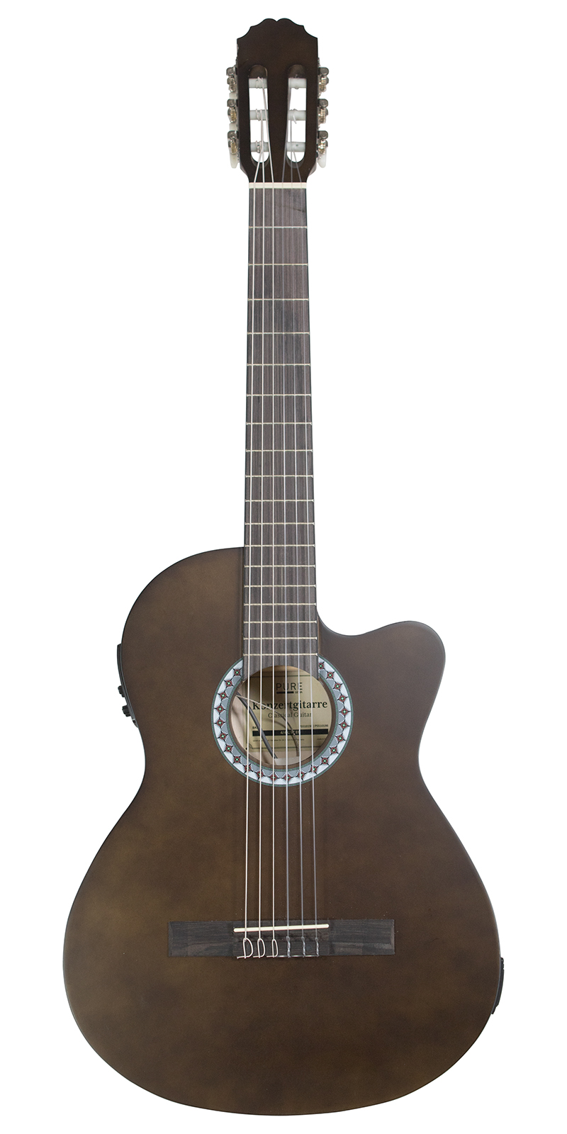 Guitarra clásica, resaque, escala 4/4” (650 mm), cuerpo de tilo, unión de ABS, diapasón y puente de madera de pakka, trastes de níquel plata, maquinaria cromada, terminado mate ecológico basado en agua, cejuela de 52 mm de ancho, pastilla piezo de puente con ecualizador de 4 bandas y afinador. Dimensiones del producto: 14 x 46 x 106 cm. Peso: 2.17 Kg.