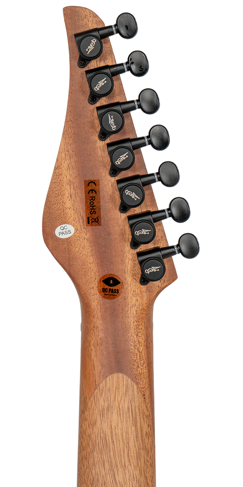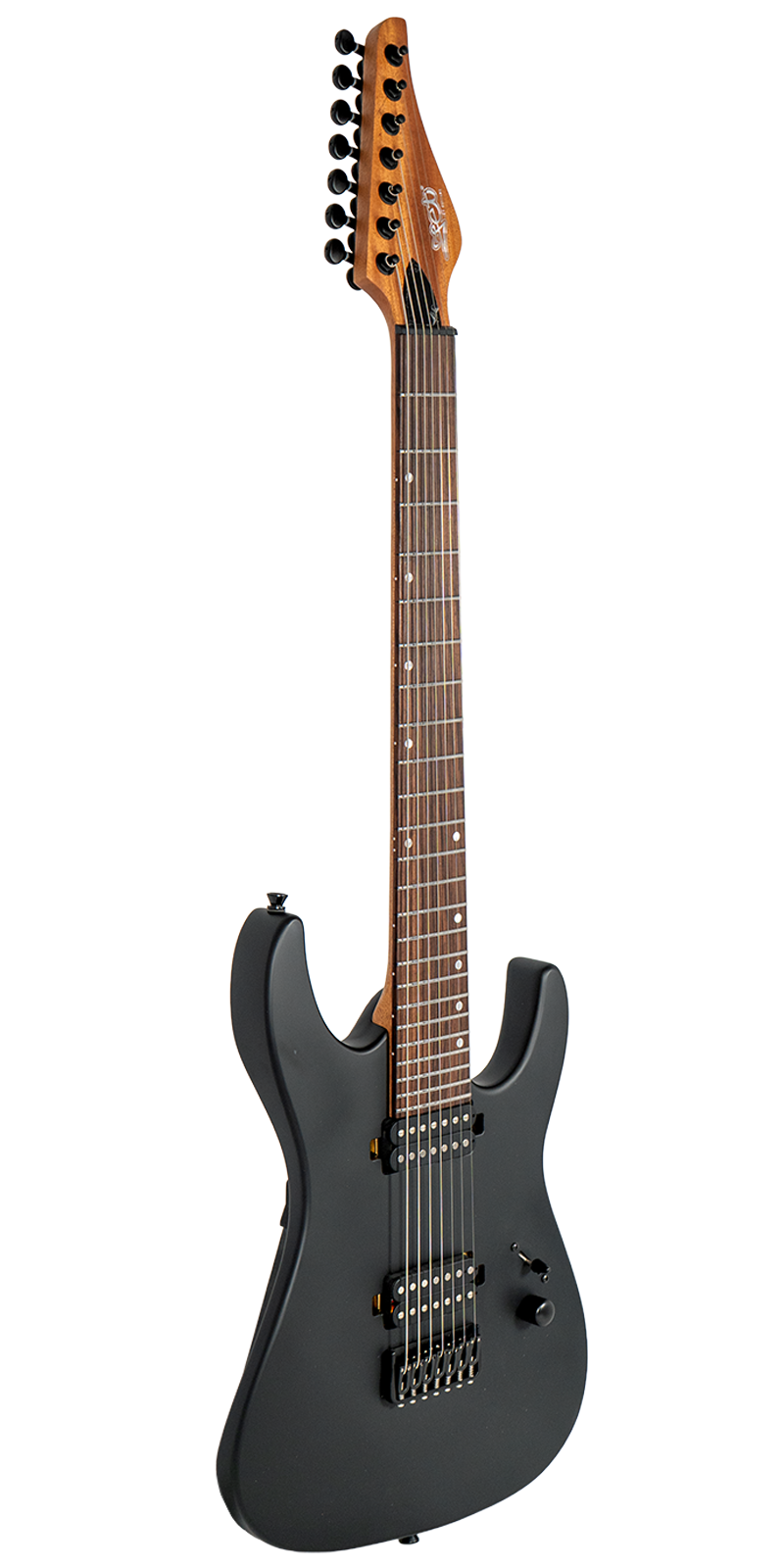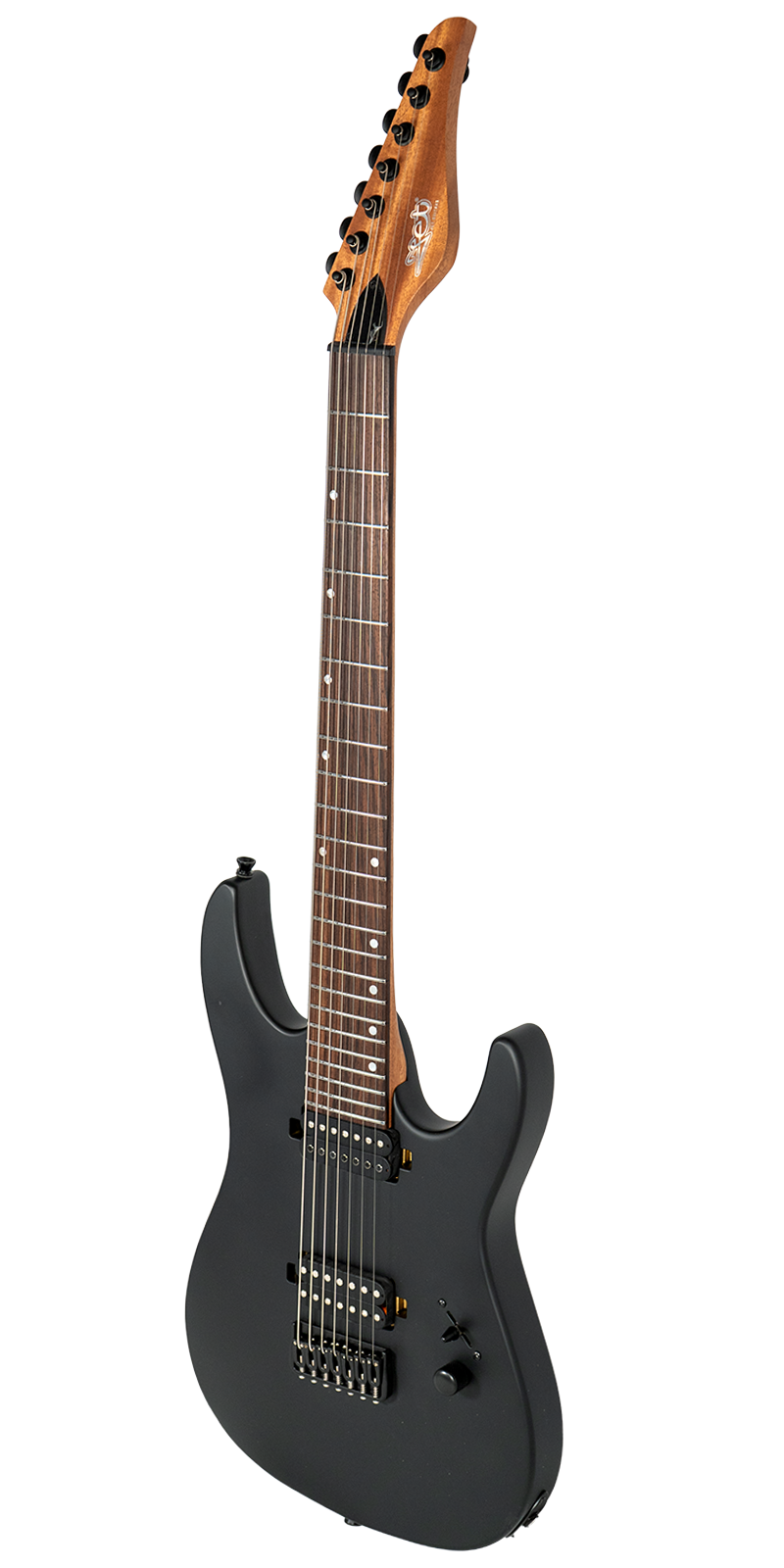 Guitarra de 7 cuerdas con cuerpo y mástil de caoba, diapasón de palisandro, escala extendida de 26.5″, perfil Modern C, 24 trastes Medium Jumbo. Pastillas HH Alnico Stygian Set directas al cuerpo, puente fijo y hardware negro locking.