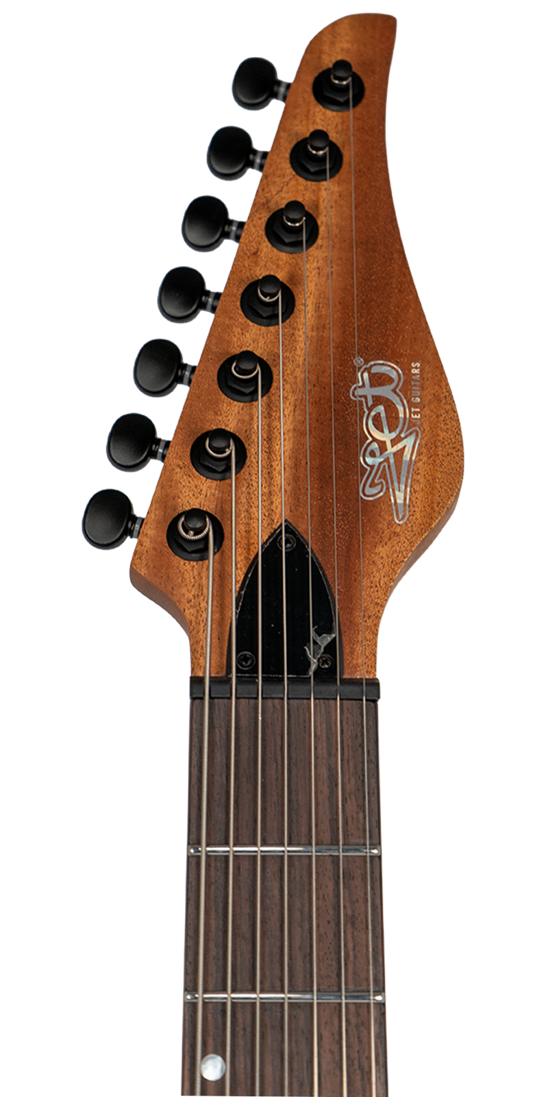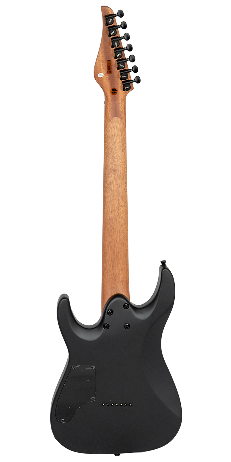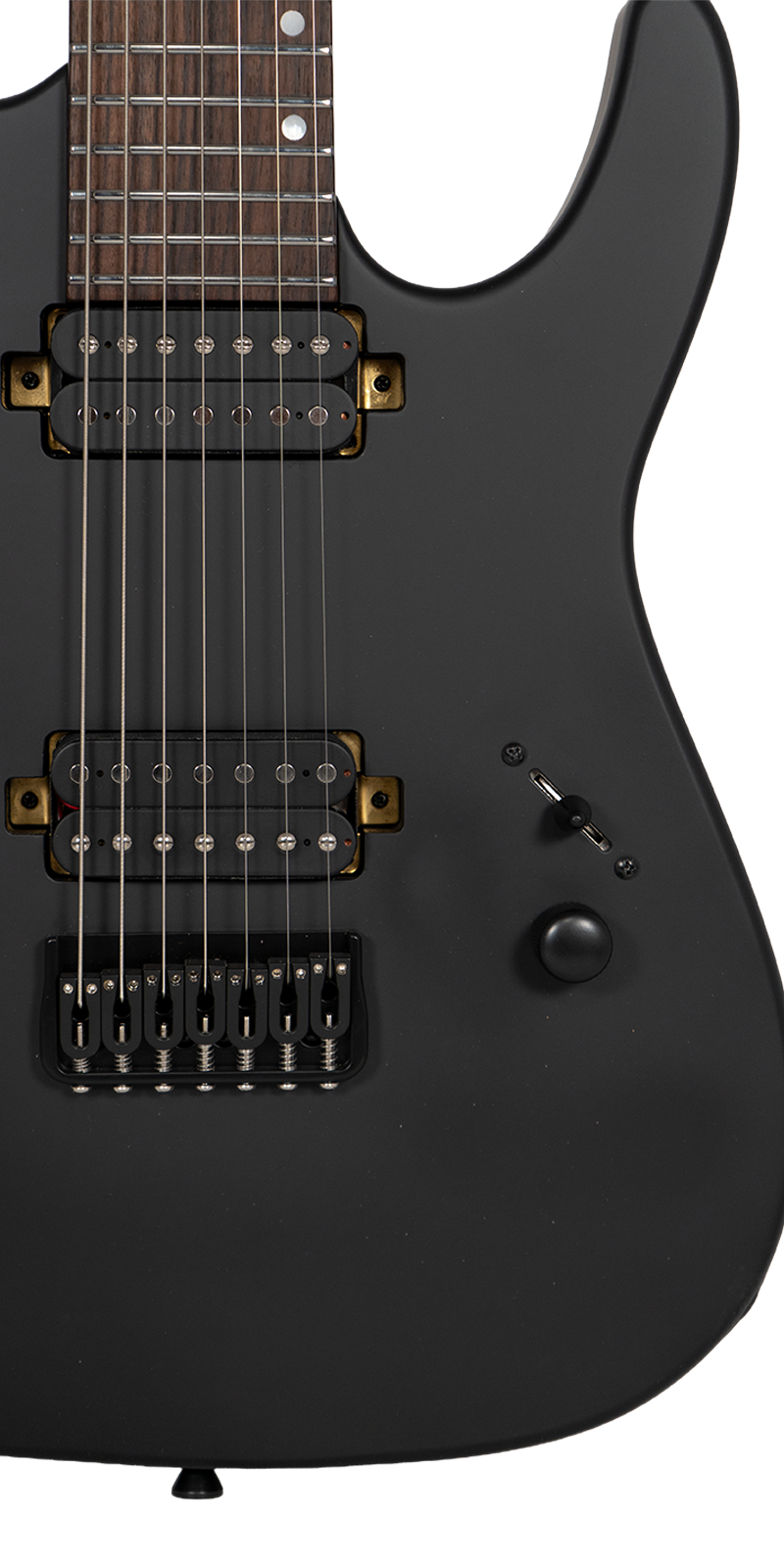Guitarra de 7 cuerdas con cuerpo y mástil de caoba, diapasón de palisandro, escala extendida de 26.5″, perfil Modern C, 24 trastes Medium Jumbo. Pastillas HH Alnico Stygian Set directas al cuerpo, puente fijo y hardware negro locking.
