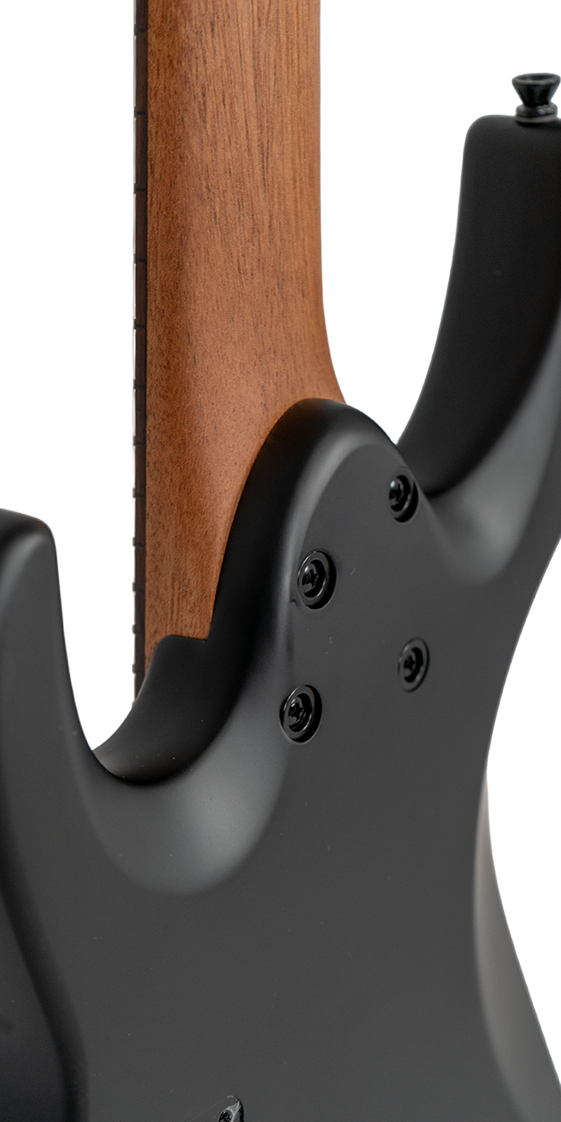 El diapasón de palisandro sobre un mástil con perfil Modern C y radio de 12″ ofrece una ejecución cómoda y veloz. La escala extendida de 26.5″ mantiene la tensión adecuada en las 7 cuerdas, mientras que los 24 trastes Medium Jumbo aseguran precisión y alcance total.