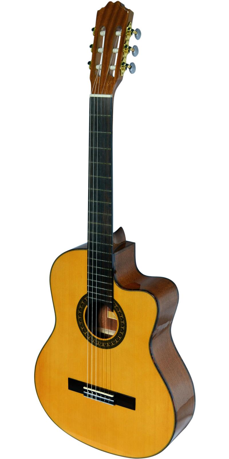 Guitarra clásica, con resaque, tapa de abeto, brazo de caoba, aros y fondos de lacewood, diapasón de palo de rosa, puente de sonokeling, color natural, cuerdas D’Addario.