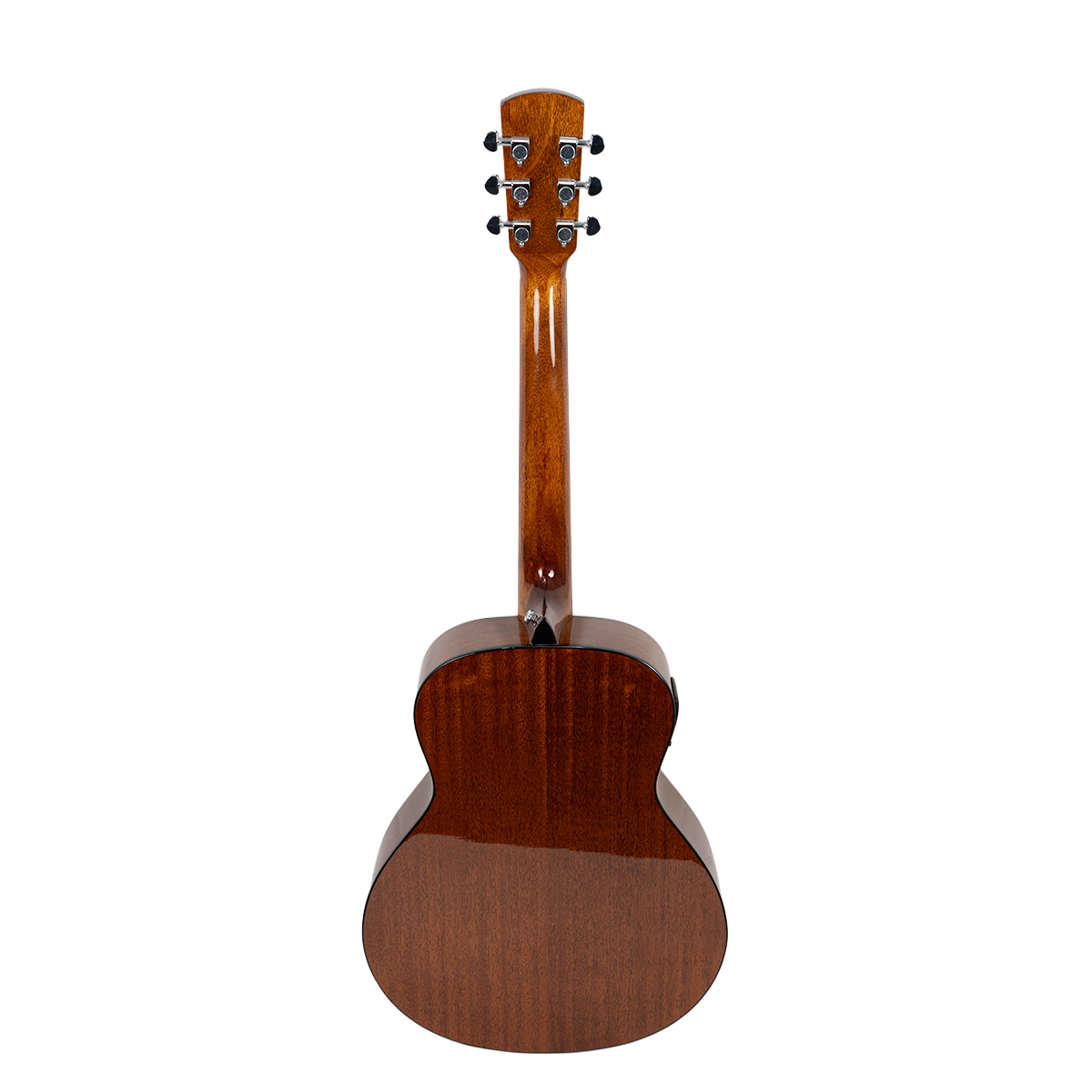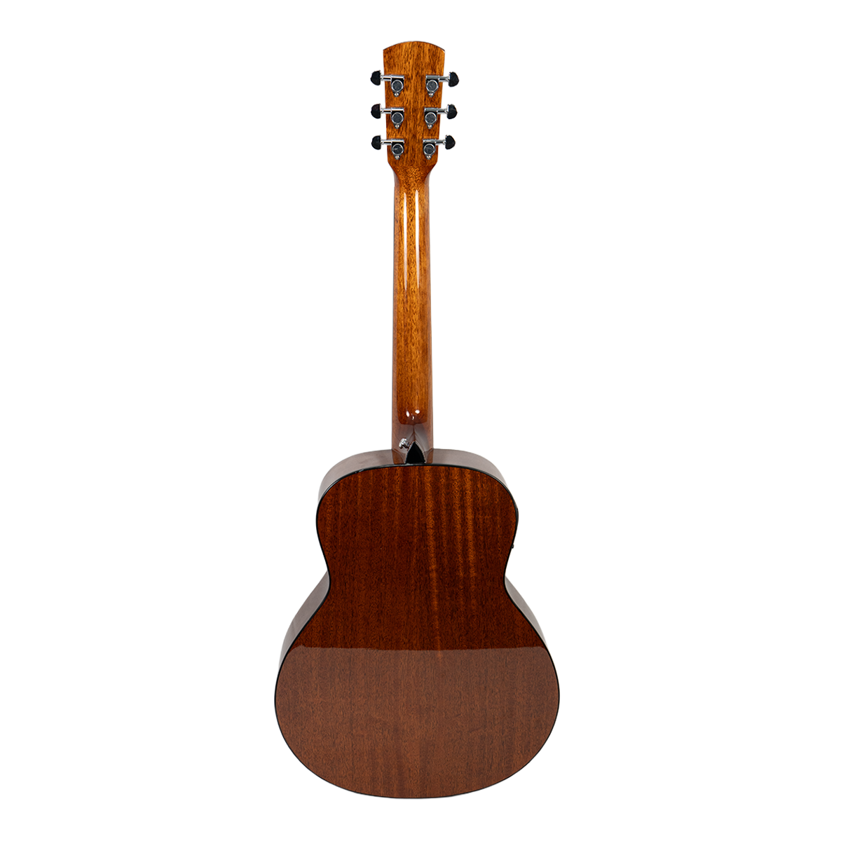 El mástil de caoba con perfil Modern D proporciona un agarre cómodo y ergonómico, ideal para rasgueos y ejecución precisa. Está equipado con un diapasón de palorrosa de radio 12″, que facilita la movilidad de los dedos sobre sus 20 trastes, mientras que la cejuela plástica de 43 mm y el truss rod doble permiten ajustes finos de curvatura y acción. La escala de 596 mm asegura una tensión equilibrada, favoreciendo comodidad y claridad en el sonido.