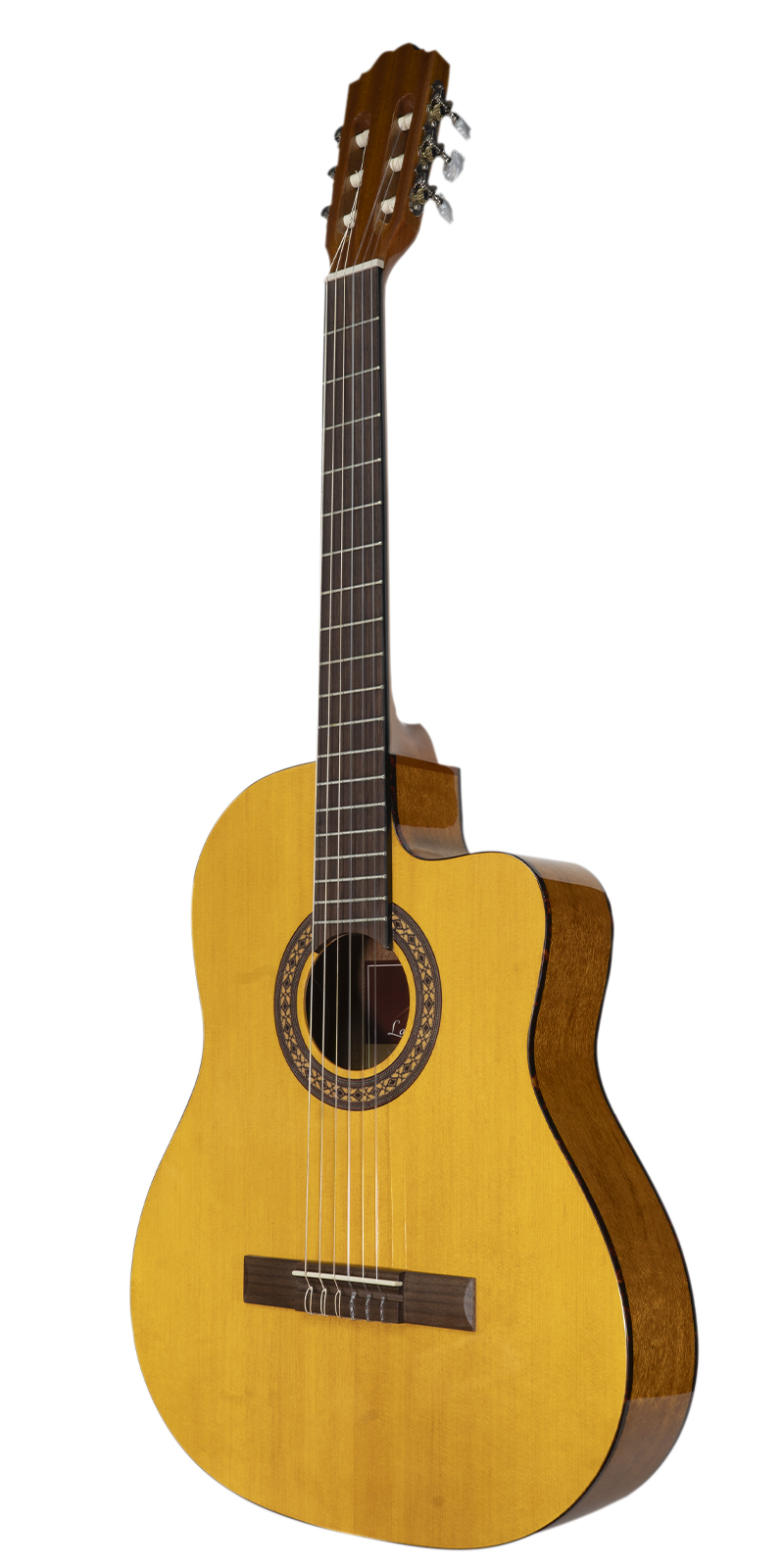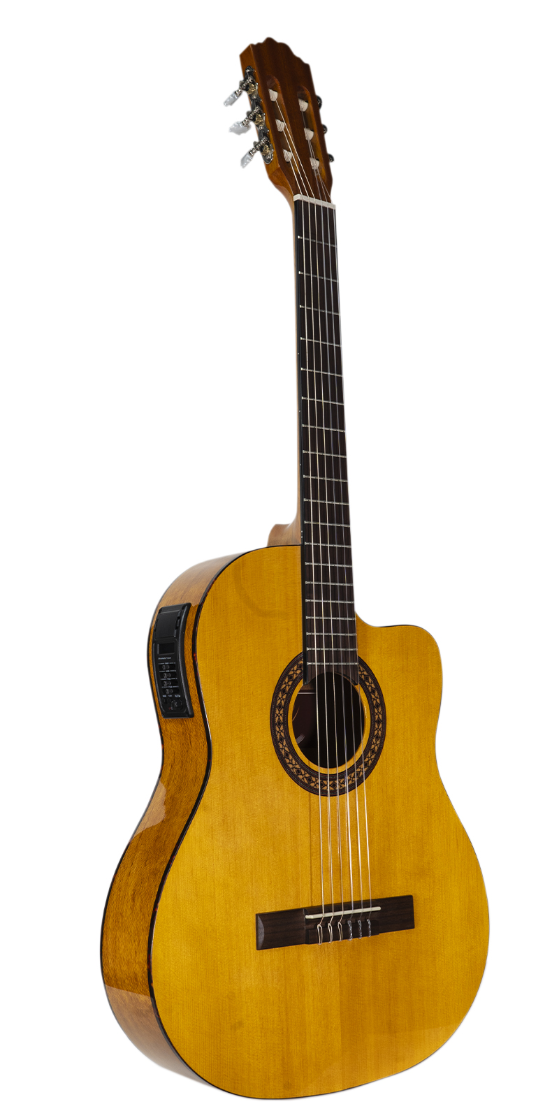 Guitarra electro acústica, canto delgado, resaque, tapa de abeto, brazo de nato, aros y fondo de lacewood, diapasón de rosewood, puente de sonokeling, ribete, color natural, preamp activo KLT-34 con afinador digital, ecualizador de 4 bandas, volumen y fase, cuerdas D’Addario de nylon.