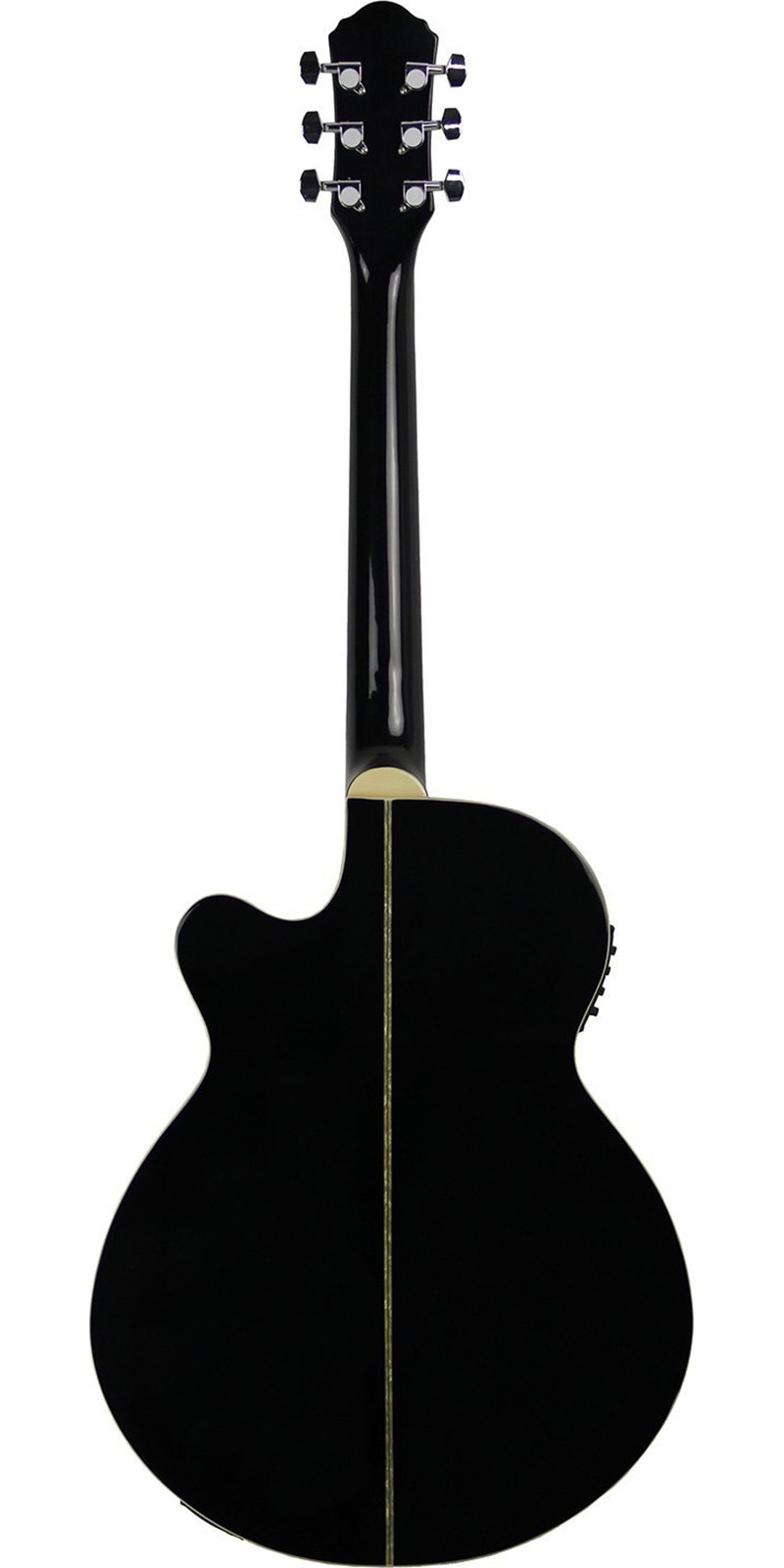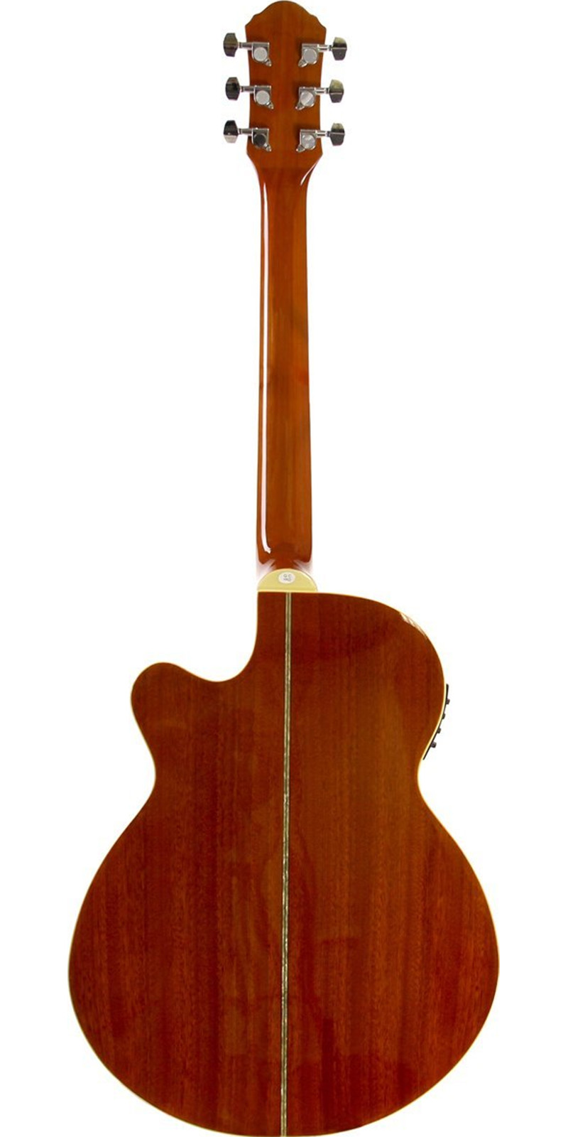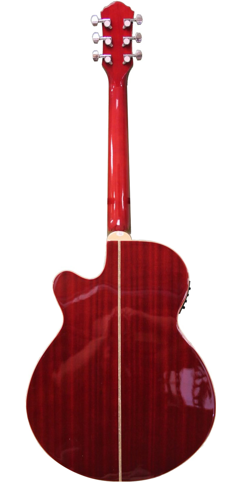 Guitarra electroacústica, tamaño concierto, terminado de alto brillo, tapa de abeto, aros y fondo de catalpa, diapasón y puente de palisandro, brazo de caoba, binding multi capa, tensor de brazo totalmente ajustable, maquinaria die-cast cromada, sistema de preamp MET-10.