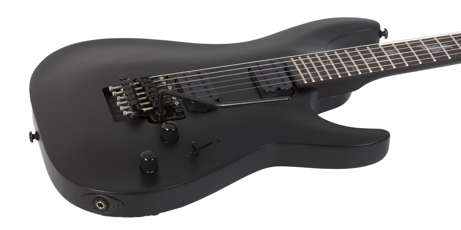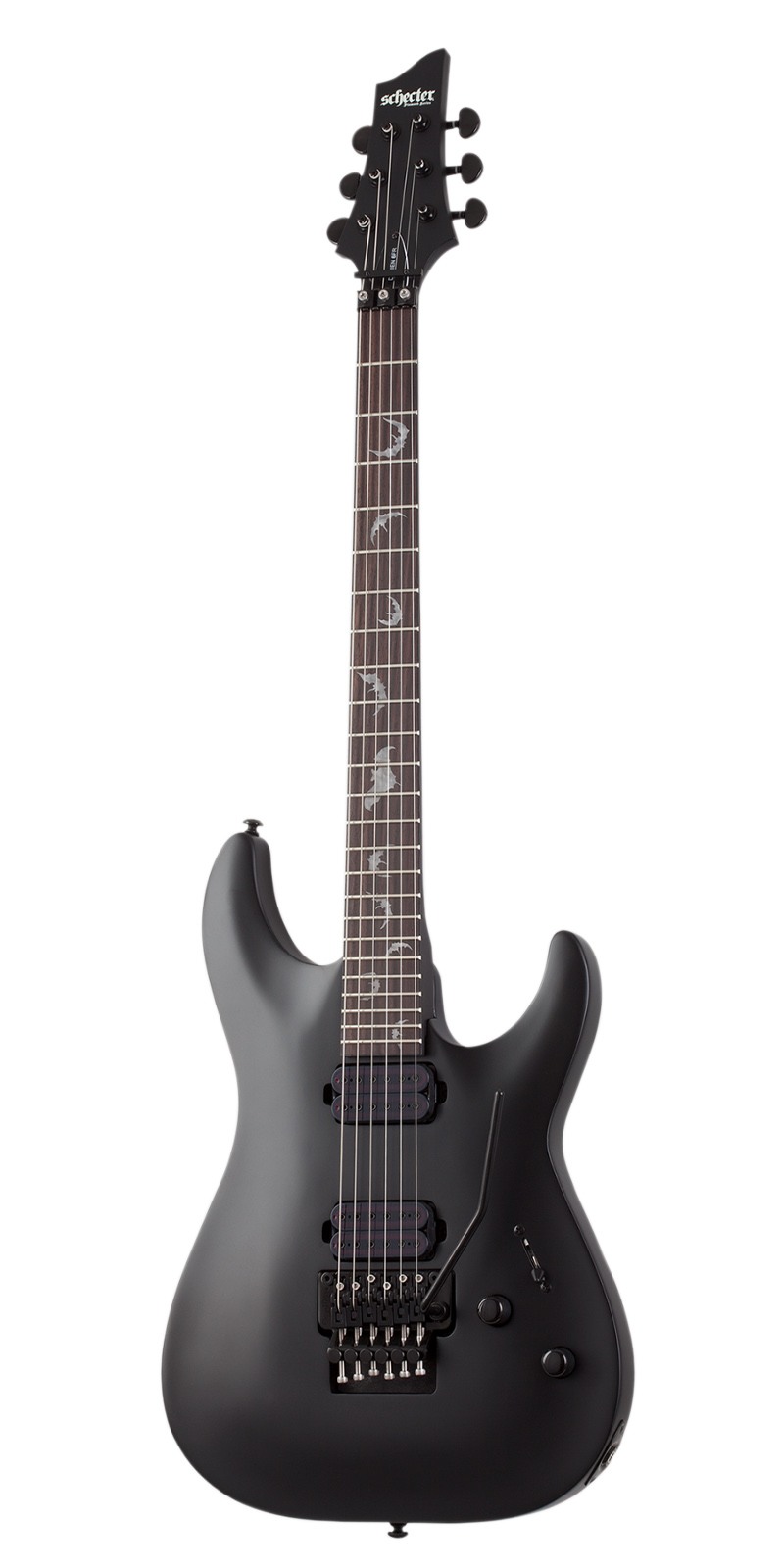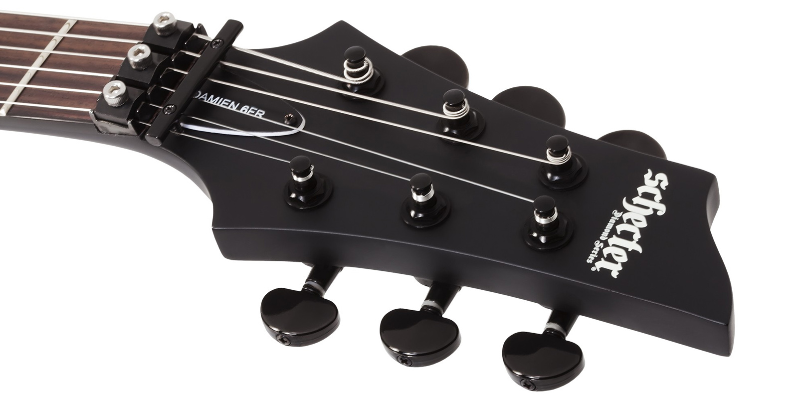 Guitarra Eléctrica Schecter DAMIEN-6 FR de cuerpo sólido es una guitarra económica de caracteristicas premium construida con cuerpo de caoba que mejora el tono y sustain, el mástil de arce de 3 piezas resiste el paso de los años. Lleva los humbuckers EMG activos y es de un rendimiento expresivo y constante por su trémolo Floyd Rose Special, además de los sintonizadores Grover Rotomatic 18:1 que brindan una afinación estable. Acabado del cuerpo Poliuretano, satín negro, radio de 14″, 24 trastes jumbo, Pastillas del mástil y puente Humbucker EMG 85 Y EMG 81. Controles 1 volumen maestro 1 tono maestro con interruptor de pastilla de 3 vias.