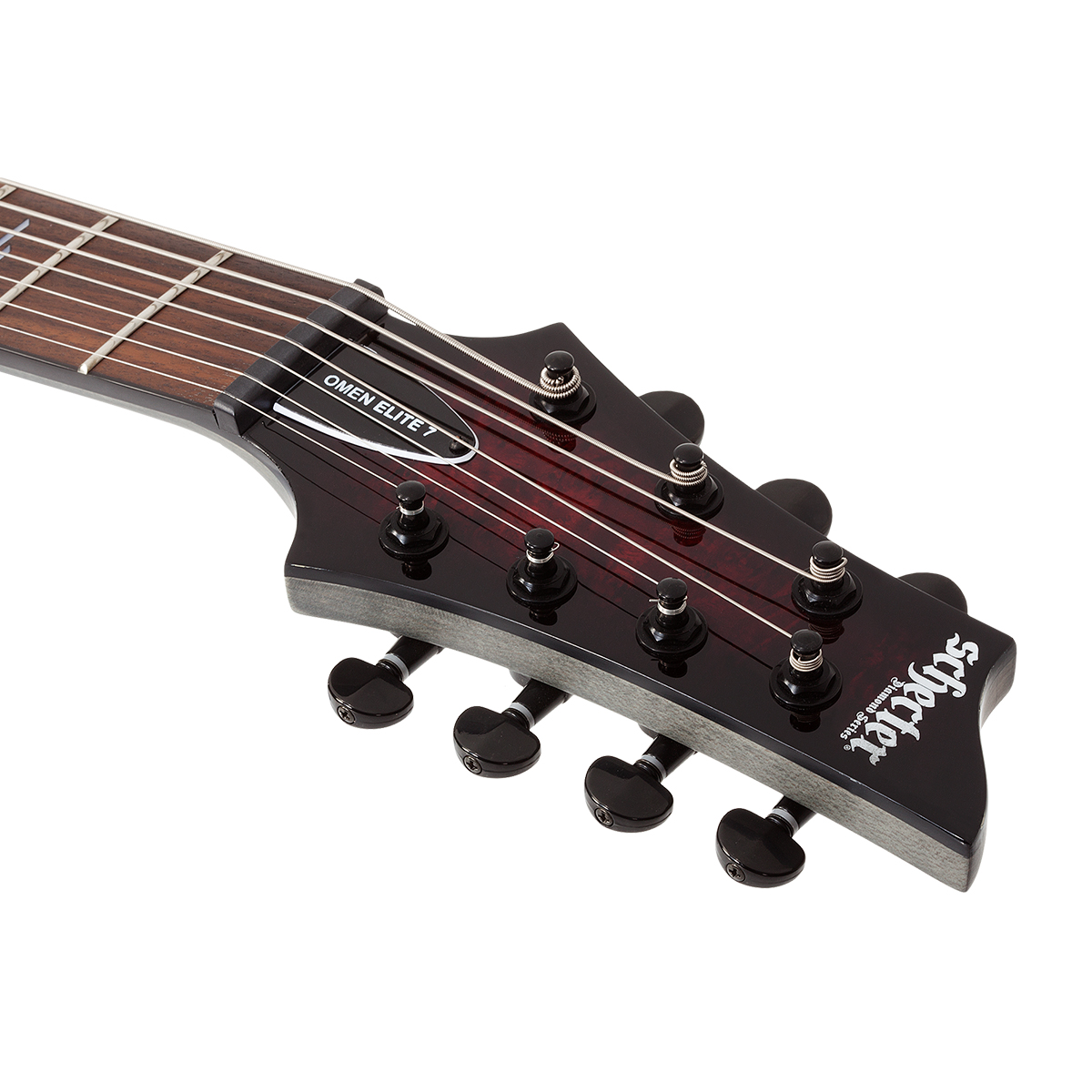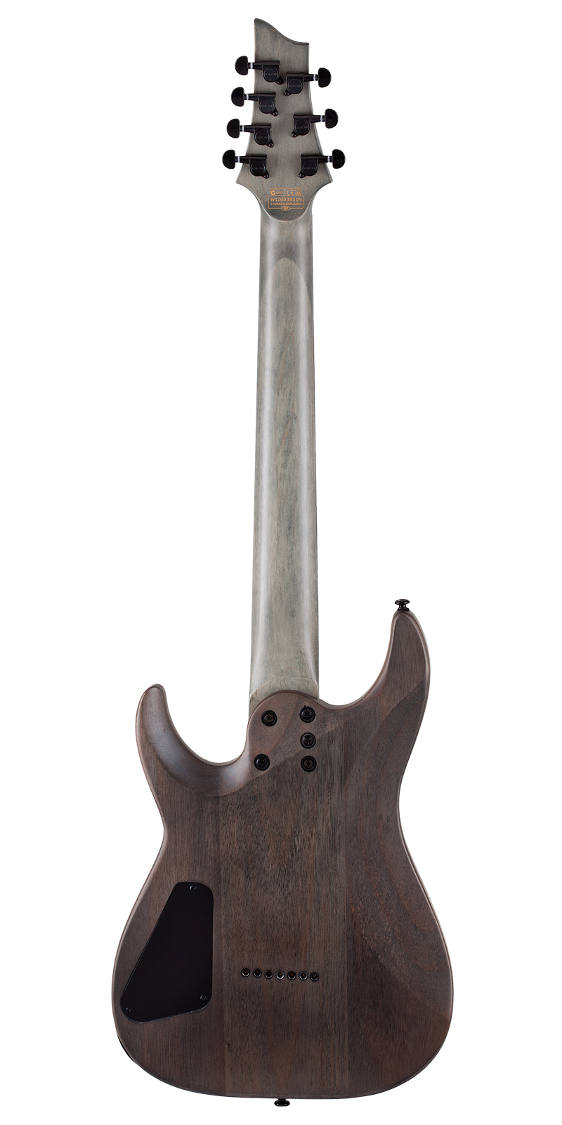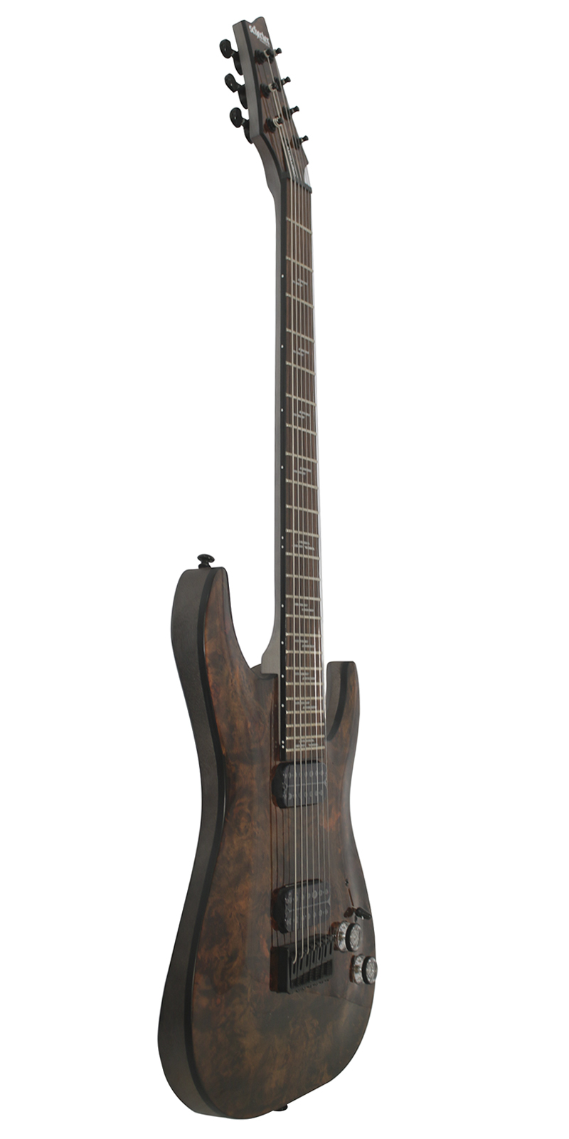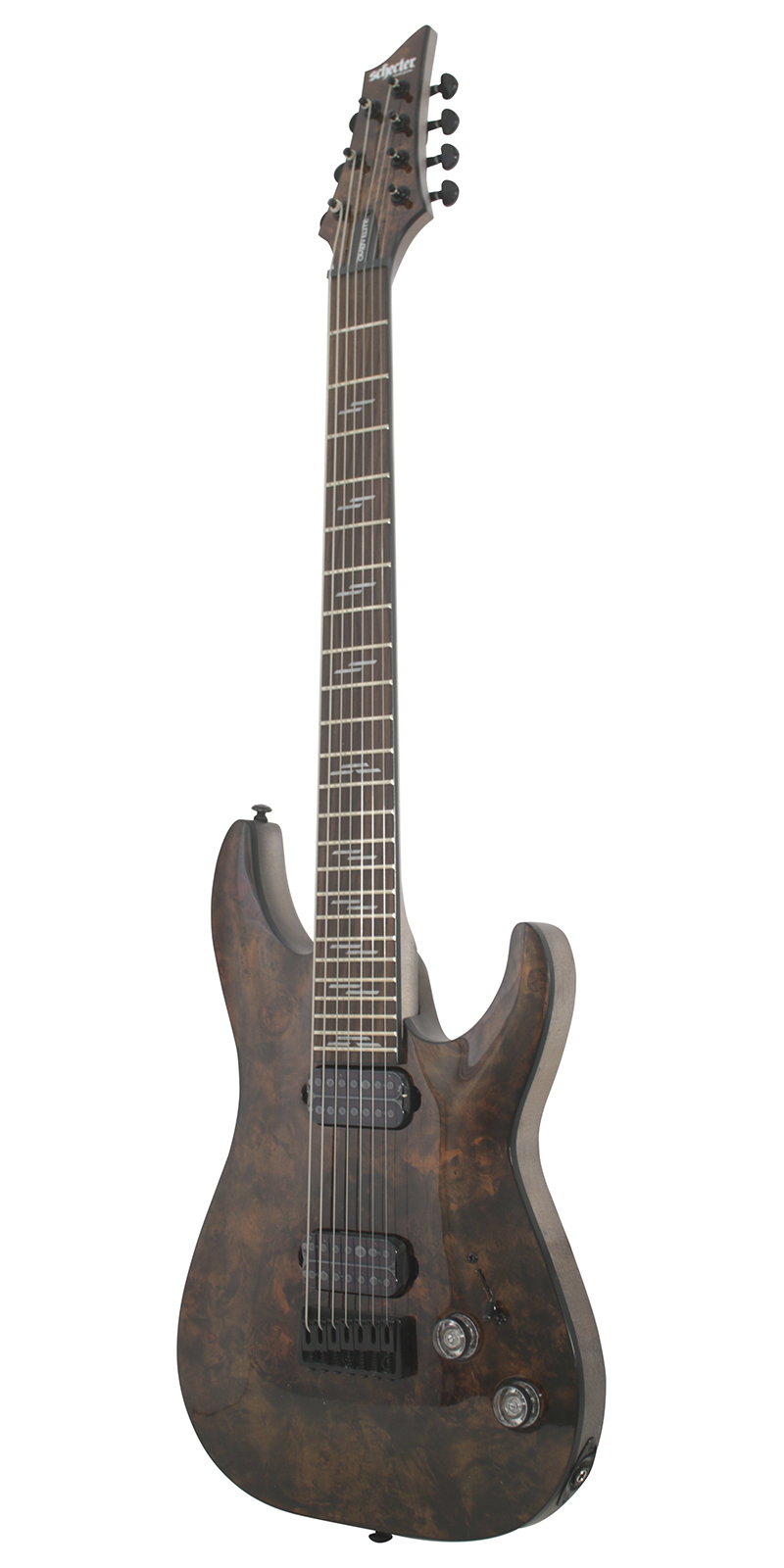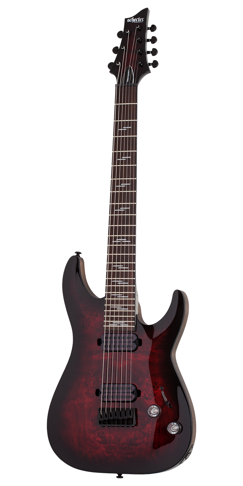 Guitarra eléctrica sólida de 7 cuerdas, cuerpo de caoba, tapa arqueada de madera burl, unión en negro, una capa, hardware negro, construcción bolt-on, puente Schecter Custom Hardtail con String Thru Body, brazo C delgado de maple, diapasón de palo de rosa de 16” (406 mm) de radio, maquinaria Schecter, incrustaciones de líneas aperladas, escala: 26.5” (673 mm), espesor en el primer traste: .787” (20 mm) y en el traste 12: .866” (22 mm), 24 trastes X-Jumbo, cejuela de Graph Tech XL Black Tusq de 1.889” (48 mm) de ancho, alma ajustable de 2 vías con tuerca Allen de 5/32” (4 mm), controles: Volumen y tono, selector de 5 posiciones, pastilla del puente: Schecter Diamond Heretic, pastilla del brazo: Schecter Diamond Heretic, perillas de metal moleteado con tornillo de fijación.
