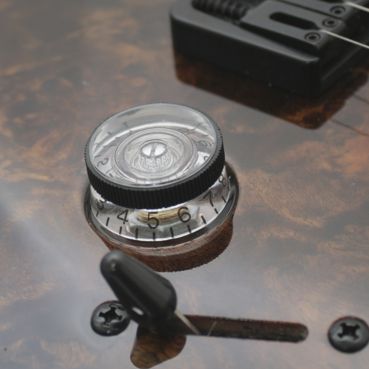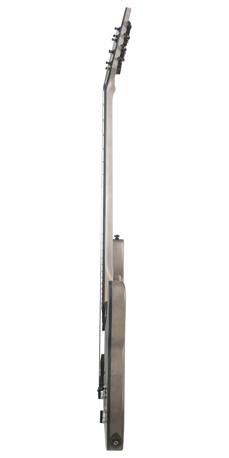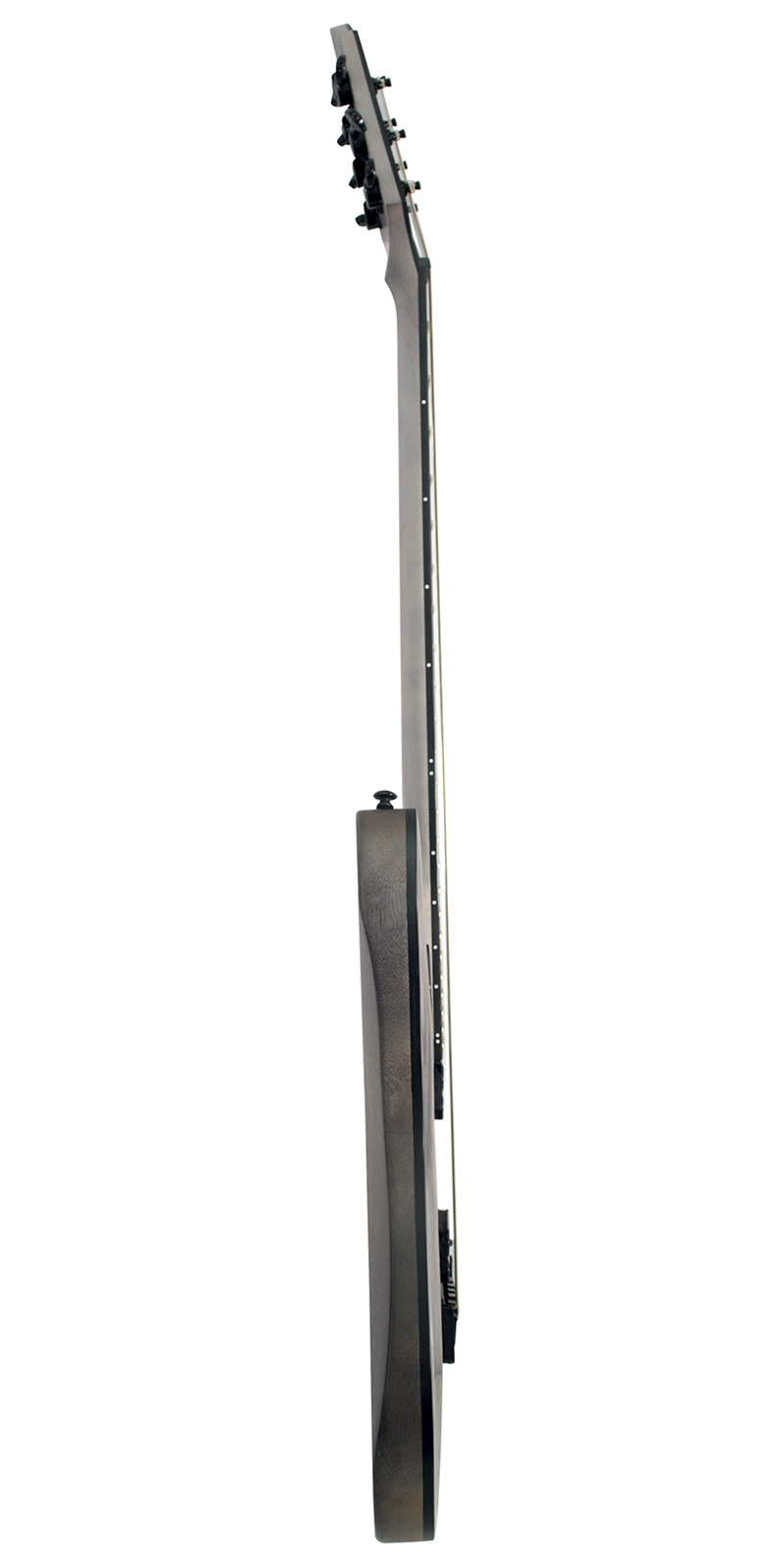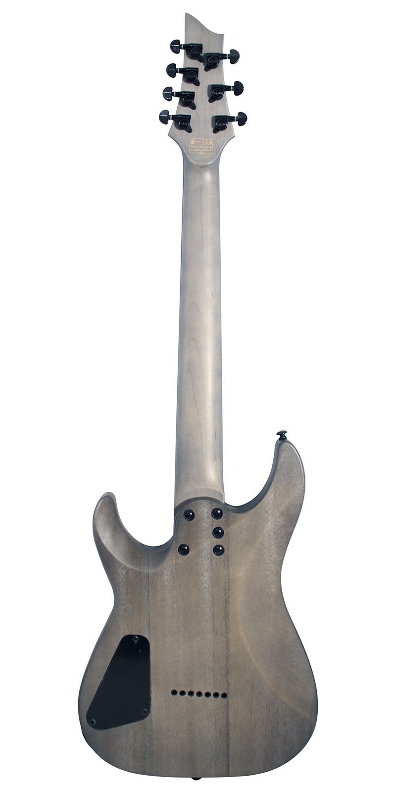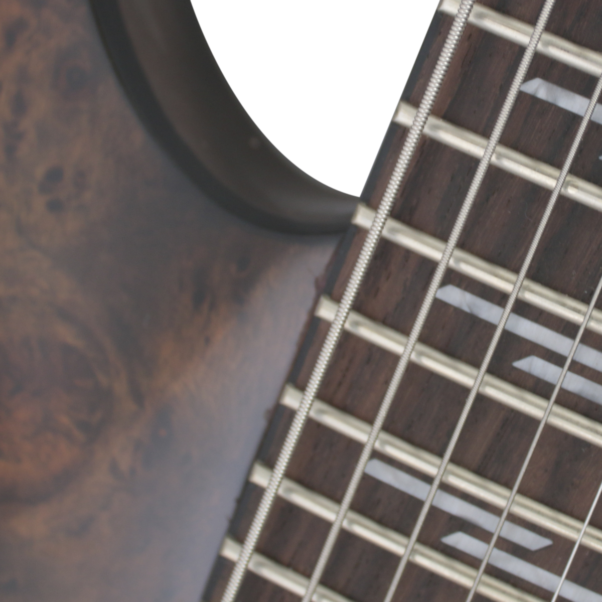 Guitarra eléctrica sólida de 7 cuerdas, cuerpo de caoba, tapa arqueada de madera burl, unión en negro, una capa, hardware negro, construcción bolt-on, puente Schecter Custom Hardtail con String Thru Body, brazo C delgado de maple, diapasón de palo de rosa de 16” (406 mm) de radio, maquinaria Schecter, incrustaciones de líneas aperladas, escala: 26.5” (673 mm), espesor en el primer traste: .787” (20 mm) y en el traste 12: .866” (22 mm), 24 trastes X-Jumbo, cejuela de Graph Tech XL Black Tusq de 1.889” (48 mm) de ancho, alma ajustable de 2 vías con tuerca Allen de 5/32” (4 mm), controles: Volumen y tono, selector de 5 posiciones, pastilla del puente: Schecter Diamond Heretic, pastilla del brazo: Schecter Diamond Heretic, perillas de metal moleteado con tornillo de fijación.