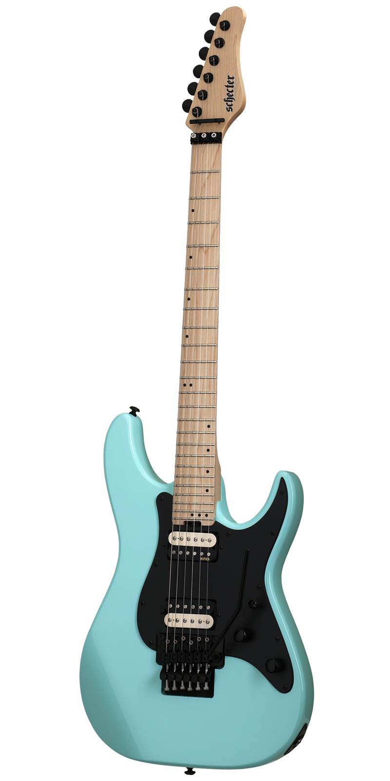 Guitarra eléctrica sólida, cuerpo de caoba, tapa plana, brazo C delgado de maple, diapasón de maple, incrustaciones puntos offset/reverse, escala: 25.5” (648 mm), 24 trastes x-jumbo, cejuela Floyd Rose Special de 1.625” (41.3 mm) de ancho, alma ajustable de 2 vías, pastilla del puente: EMG Retro Active Hot 70, pastilla del brazo: EMG Retro Active Hot 70, un volumen y un tono, selector de 3 posiciones, hardware negro, puente: Floyd Rose Special ‘Hot Rod’ Locking Tremolo (Exclusivo de Schecter), maquinaria Schecter, perillas de metal moleteado con tornillo de ajuste, construcción bolt-on.