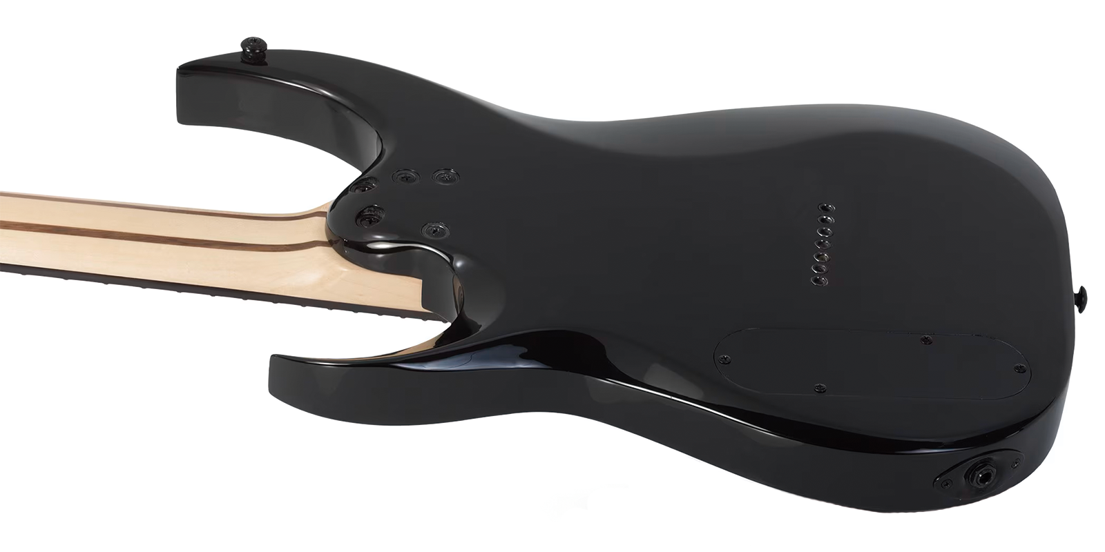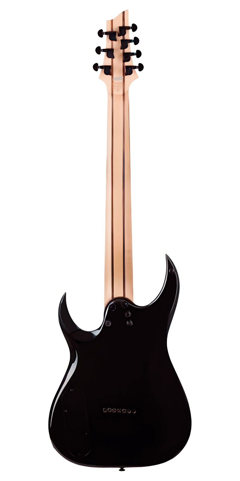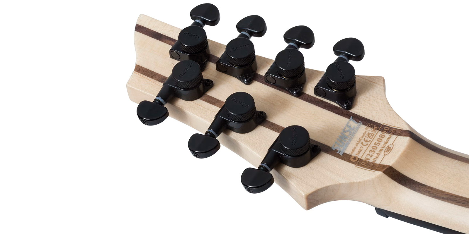 El mástil está compuesto por 5 piezas de Arce y Rosewood, reforzado con barras de fibra de carbono que aseguran una excelente estabilidad y resistencia a los cambios de temperatura y humedad. El perfil del mástil es un Ultra Thin “C”, que permite una sensación rápida y cómoda al tocar. El diapasón de Ébano con un radio de 16″ está adornado con anillos metálicos offset en los trastes, lo que no solo mejora su estética, sino que facilita la ubicación de los trastes al tocar. Además, las marcas laterales son puntos blancos, lo que mejora la visibilidad durante el rendimiento.