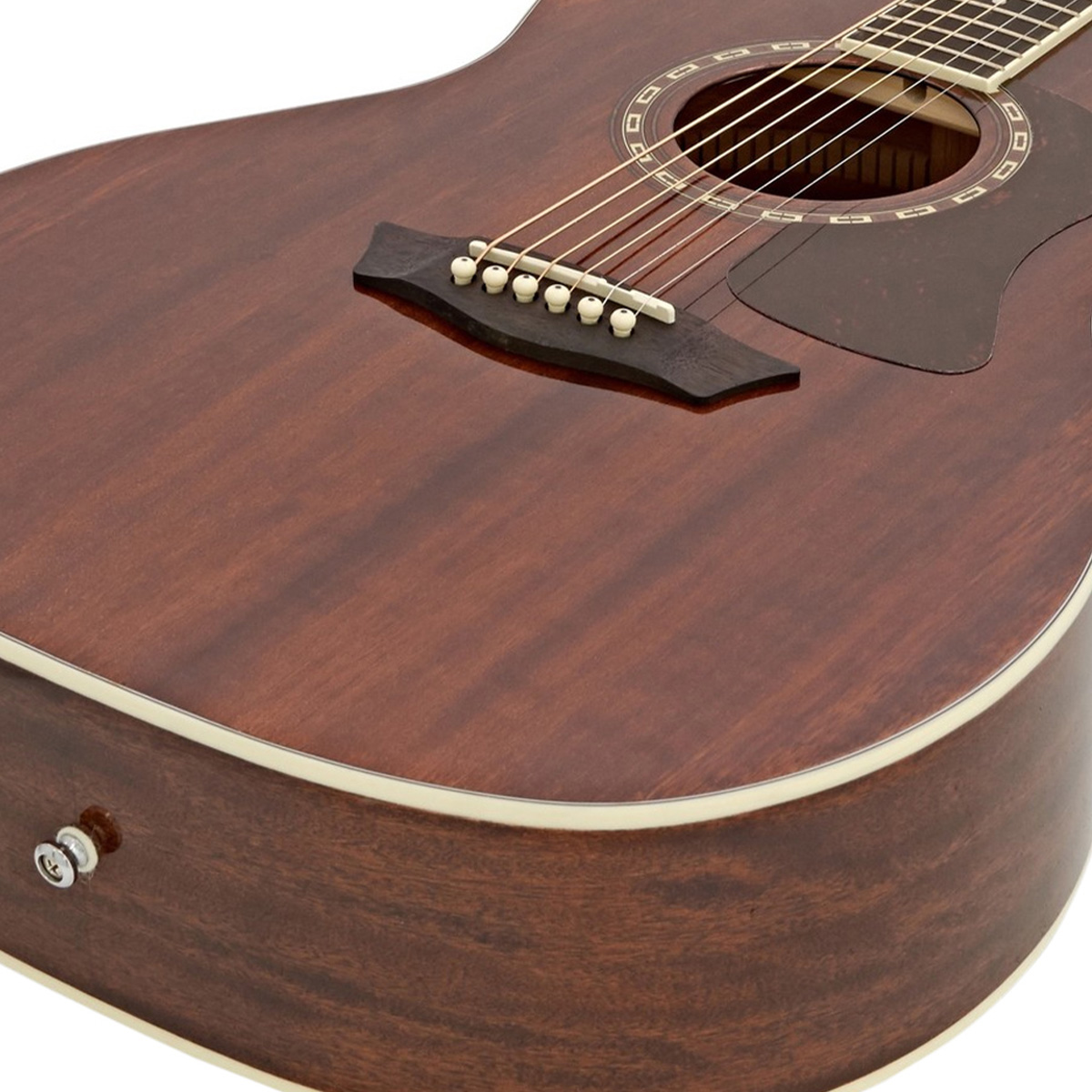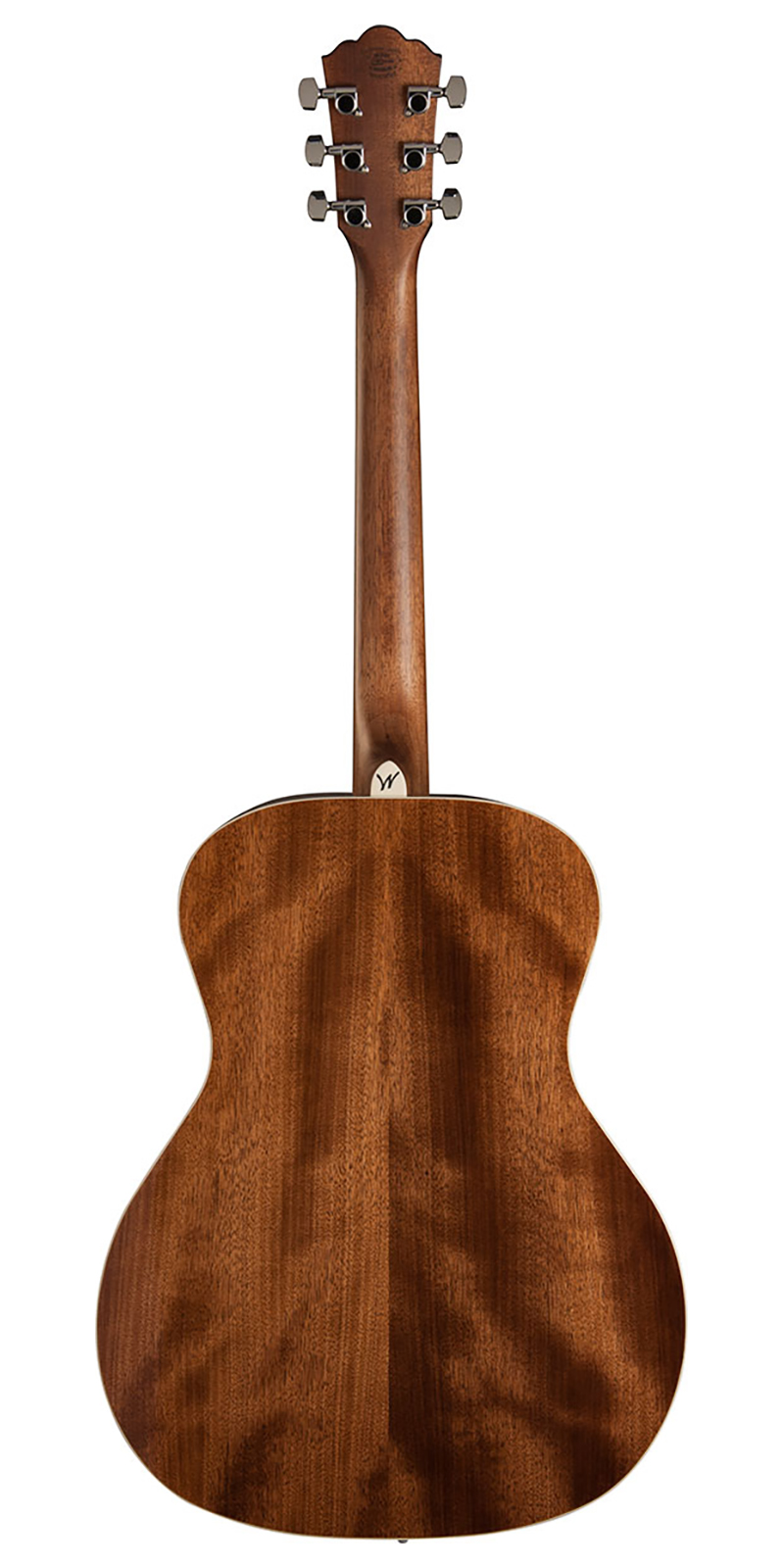 Guitarra acústica texana (Grand Auditorum), tapa de caoba sólida, aros y fondo de caoba, refuerzo Cathedral con pico festineado X, roseta Washburn Heritage, color natural, terminado al alto brillo, brazo de caoba satinada con alma de 2 vías, diapasón de ovangkol, 20 trastes, incrustaciones de puntos, cejuela Graphtech Nubone de 1-11/16″ de ancho, escala: 25-1/2″, hardware cromado, puente de ovangkol, maquinaria cromada diecast, cuerdas D’Addario EXP light gauge phosphor bronze.