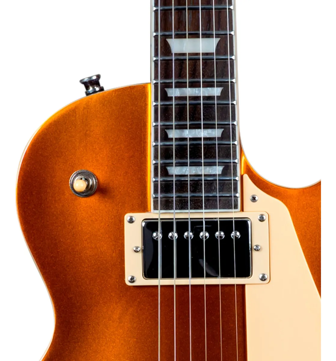 Estética y Ejecución: El diapasón de madera tostada (Mixed Ebony o Roasted, según lote) ofrece una superficie de ejecución suave y oscura que contrasta elegantemente con el dorado del cuerpo y el binding (cenefa) alrededor del instrumento. Es la guitarra definitiva para el músico que busca la estética y el sonido de una Les Paul clásica, pero con la fiabilidad y las mejoras de la ingeniería moderna.