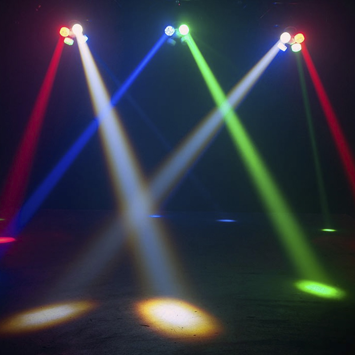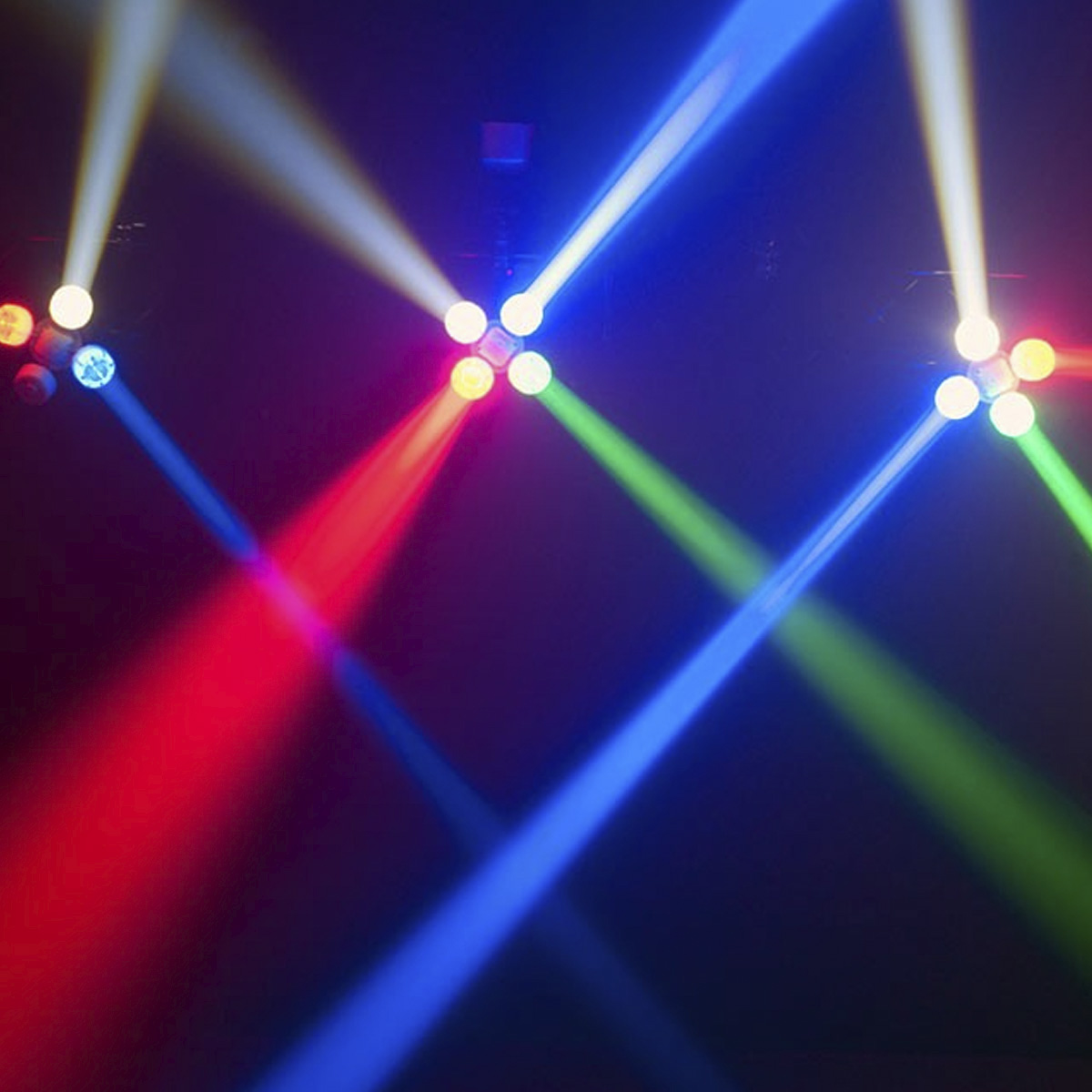 Rotobeam, 4 cabezales de LED (1 rojo, 1 verde, 1 azul y 1 blanco) efecto Helicóptero con giro continuo de 360 grados, Haz de luces que giran y luz estroboscópica activados con el sonido de la música, no tiene ciclo de trabajo, compatible con el control remoto UC-IR (no incluido), programa automático con diferentes patrones de color (no seleccionable por el usuario), rotación variable, incluye yugopara montar en la pared o el soporte de truss, consumo de energía: 19 watts máximo.