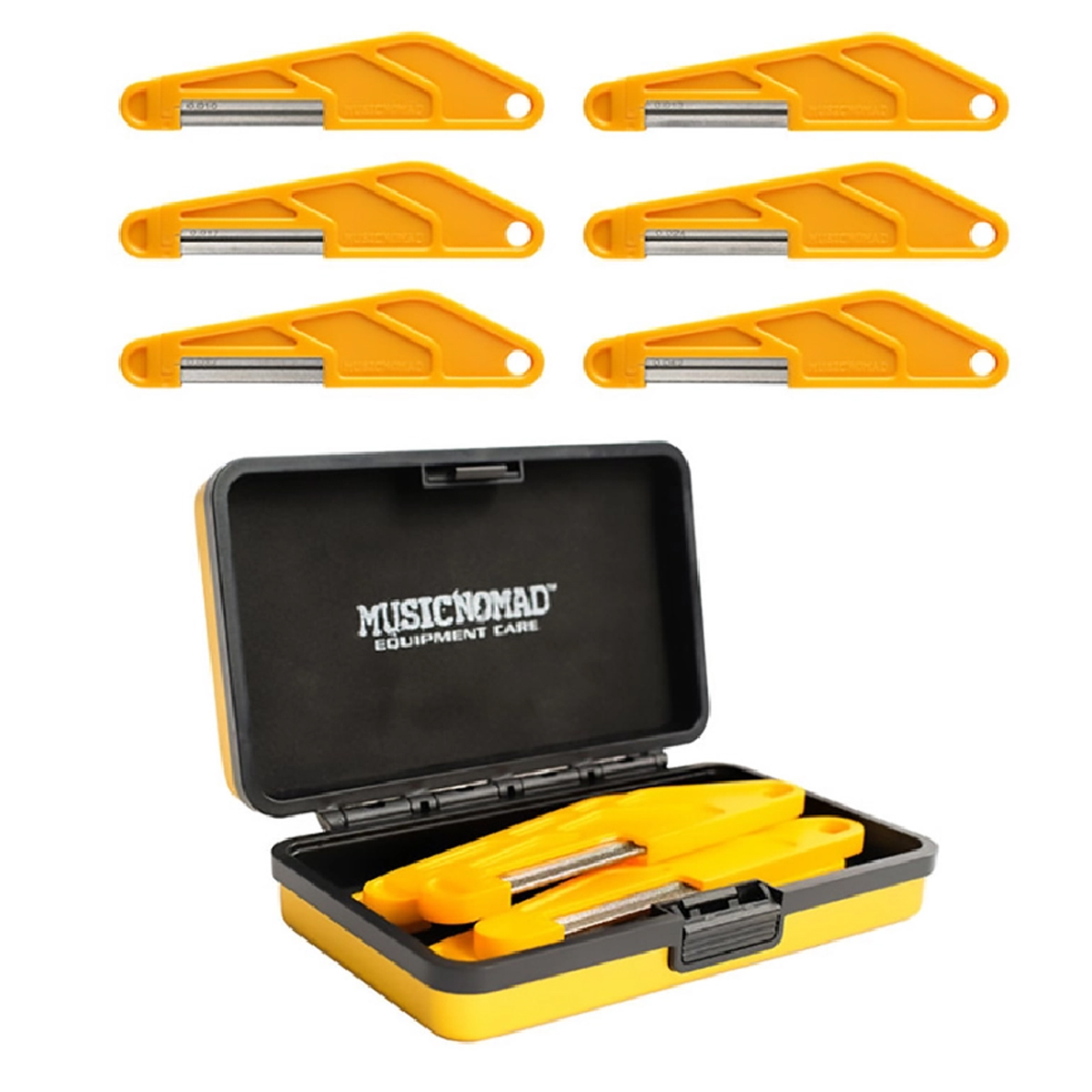 Las limas de cejuela con patente pendiente de Music Nomad cuentan con un revolucionario recubrimiento de diamante y un diseño de hoja redonda en forma de cuerda que da como resultado cortes suaves y precisos. Cortan y pulen ranuras al mismo tiempo y no de desplazan como las limas dentadas comunes. El revestimiento de diamante industrial uniforme, corta y pula todos los materiales de cejuela más comunes como nylon, hueso, grafito y TUSQ. Incluso funcionan de maravilla en monturas. Agregamos un mango ergonómico para una comodidad y control total de tu corte o puedes quitar la cuchilla del mango como una opción de corte alternativa. Este set personalizado viene con 6 tamaños de limas de cejuela para guitarra eléctrica, cuerdas súper ligeras. Incluso incluimos una caja de aluminio compacta y resistente.