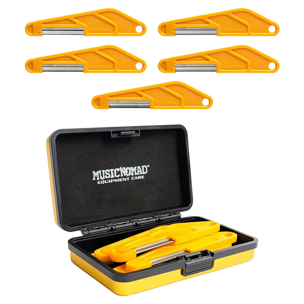 Las limas de cejuela con patente pendiente de Music Nomad cuentan con un revolucionario recubrimiento de diamante y un diseño de hoja redonda en forma de cuerda que da como resultado cortes suaves y precisos. Cortan y pulen ranuras al mismo tiempo y no de desplazan como las limas dentadas comunes. El revestimiento de diamante industrial uniforme, corta y pula todos los materiales de cejuela más comunes como nylon, hueso, grafito y TUSQ. Incluso funcionan de maravilla en monturas. Agregamos un mango ergonómico para una comodidad y control total de tu corte o puedes quitar la cuchilla del mango como una opción de corte alternativa. Este set personalizado viene con 6 tamaños de limas de cejuela para guitarra eléctrica, cuerdas súper ligeras. Incluso incluimos una caja de aluminio compacta y resistente.