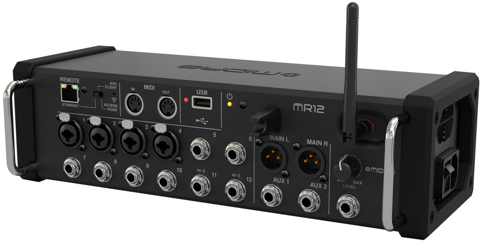 Mezcladora digital de 12 entradas para tablets/iPad/Android con 4 preamplificadores Midas PRO, 8 entradas de línea, para aplicaciones en vivo y en estudio, enrutador Wifi integrado para operación directa sin necesidad de enrutadores externos, mezcla automática estilo Dugan que gestiona automáticamente el intercambio de ganancia del micrófono, conector USB para grabación y reproducción estéreo WAV sin compresión, 4 motores de efectos de procesamiento de señal digital, orejas de rack y topes de protección incluidos para aplicaciones flexibles de rack y en escenario, 6 buses auxiliares y LR principal con inserciones, procesamiento dinámico completo y ecualizador paramétrico de 6 bandas o ecualizador gráfico de 31 bandas, 2 salidas auxiliares TRS y 2 salidas principales XLR más conector para teléfono, procesamiento de señal digital de punto flotante de 40 bits, aplicaciones gratuitas para iOS, Android y PC/Mac/Linux disponibles para operación remota por medio de Ethernet, LAN o WiFi, entrada y salida MIDI que permite controlar la mezcladora a través de equipos MIDI, futuras actualizaciones de firmware disponibles en la página oficial de MIDAS, fuente de alimentación conmutada universal de rango automático, dimensiones: 333 x 149 x 140 mm, peso: 2.9 kg.