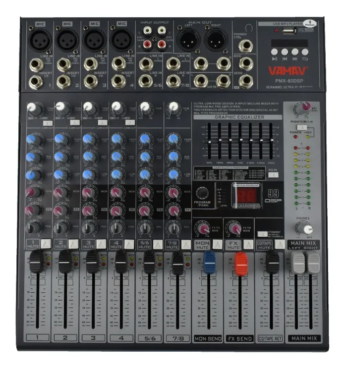 La Vamav PMX-80 DSP es una potente mezcladora amplificada de 8 canales con procesador digital de efectos. Solución integral para audio en vivo y eventos.