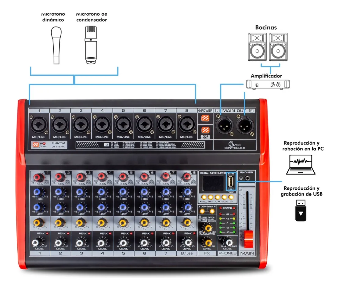 La Mixer Digital Profesional Premiata Mod. CONTROLLO-8 representa la evolución en el control de audio para eventos y estudios modernos. A diferencia de las consolas analógicas, el modelo CONTROLLO-8 permite el almacenamiento de escenas, procesamiento dinámico interno (compresores, compuertas y ecualizadores paramétricos) y una ruta de señal ultra limpia con convertidores AD/DA de alta resolución. Su diseño ergonómico facilita el flujo de trabajo en vivo, permitiendo ajustes rápidos y precisos. Es la herramienta ideal para ingenieros de sonido que buscan la versatilidad de lo digital en un chasis robusto, compacto y confiable.