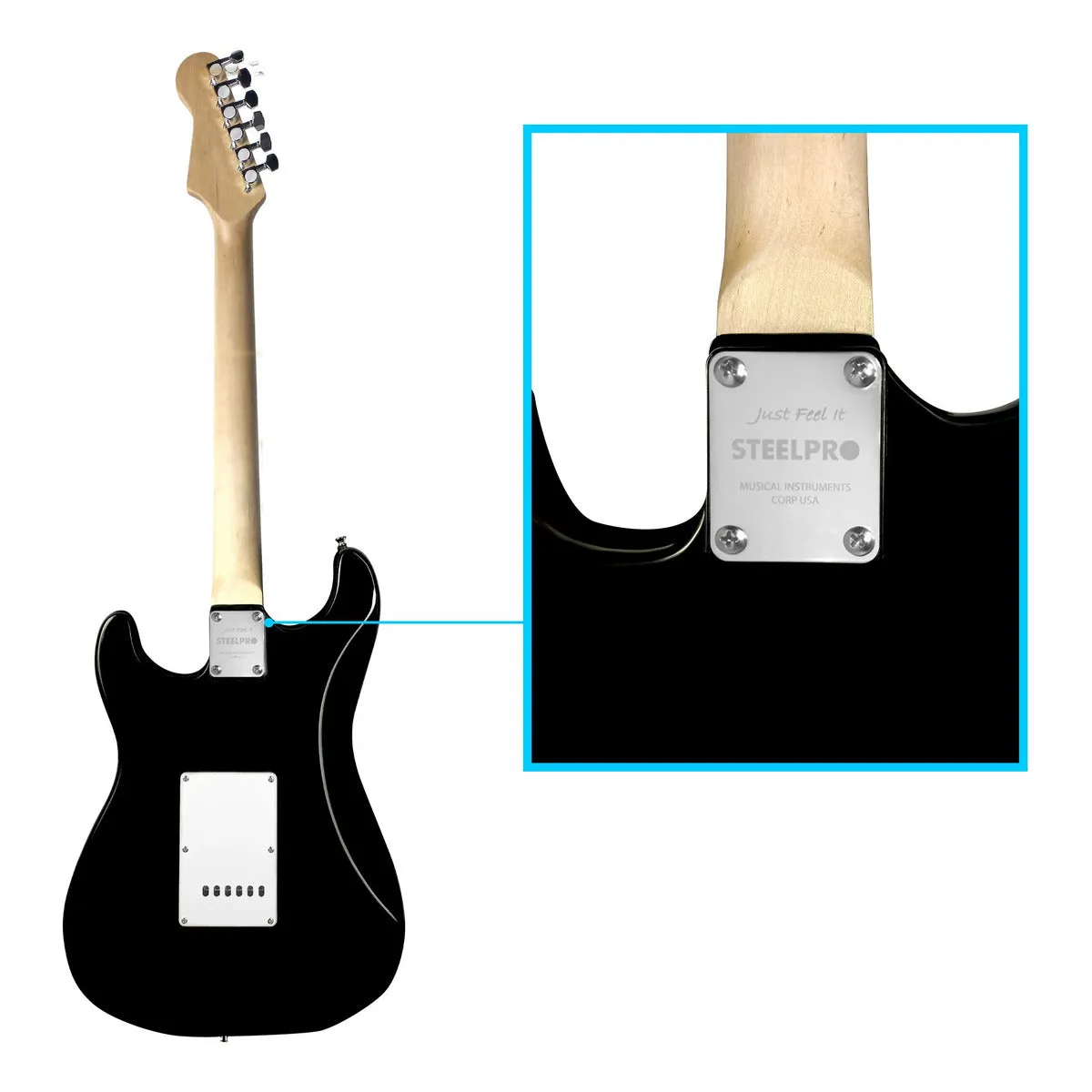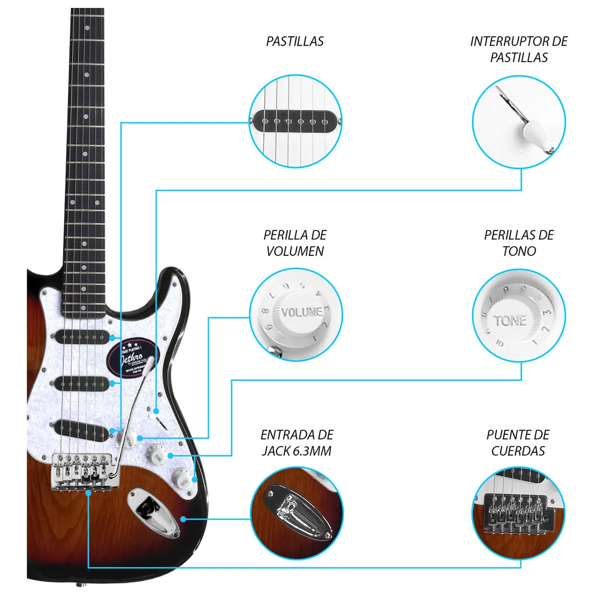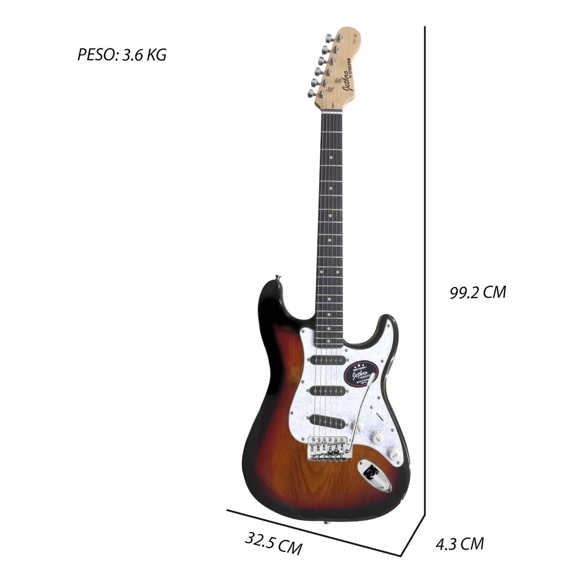 El Paquete Guitarra Eléctrica Steelpro SC Series es un kit de iniciación completo con una guitarra de cuerdas de metal en un clásico acabado 3 Tonos (Sunburst) Incluye pastilla activa, funda, correa, y accesorios esenciales, siendo ideal para principiantes.